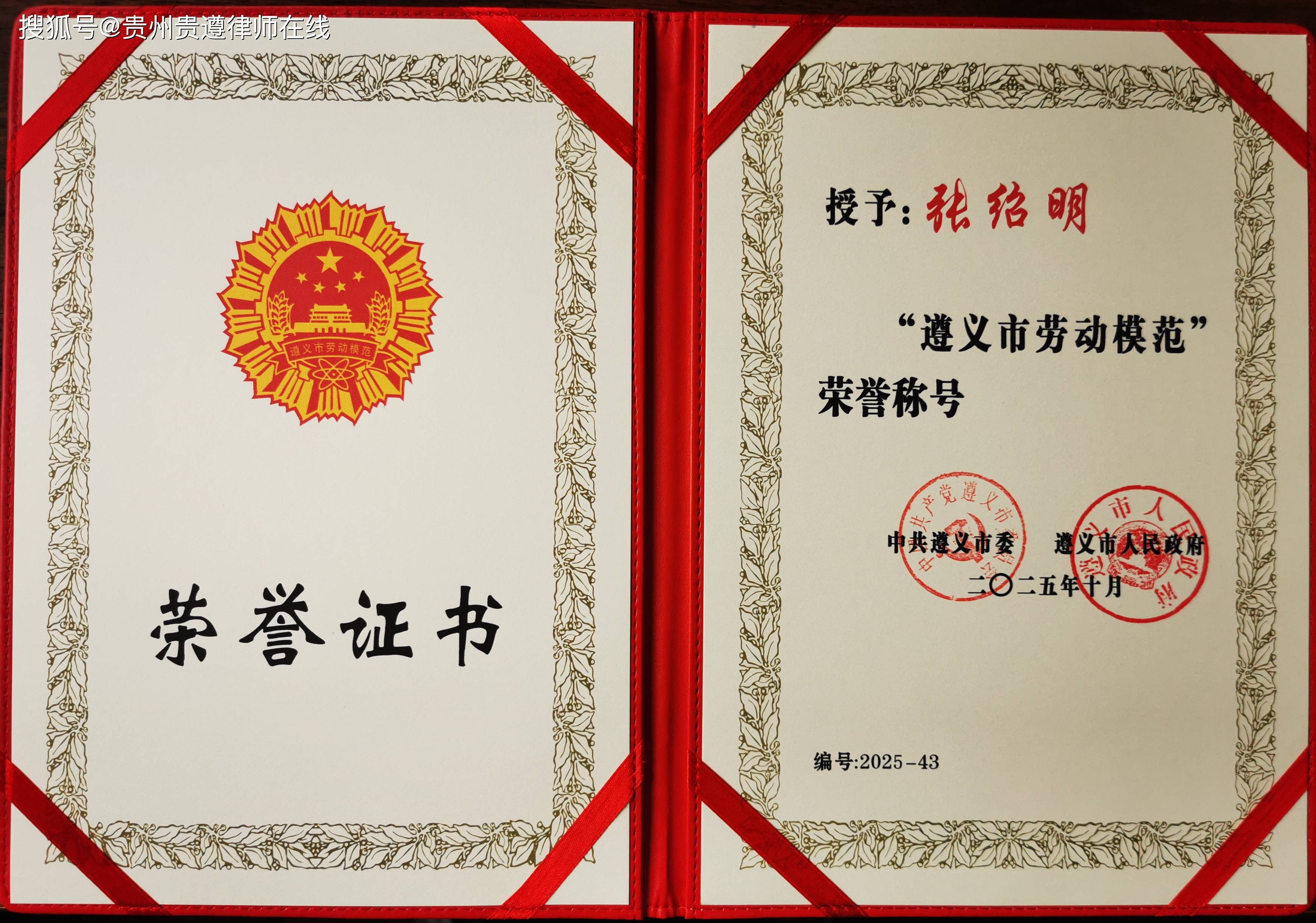 • 2025年10月16日,遵义市劳动模范和先进工作者表彰大会隆重召开。贵州贵遵律师事务所主任张绍明律师被授予“遵义市劳动模范”荣誉称号,成为本次表彰中全市律师行业唯一获此殊荣的代表。