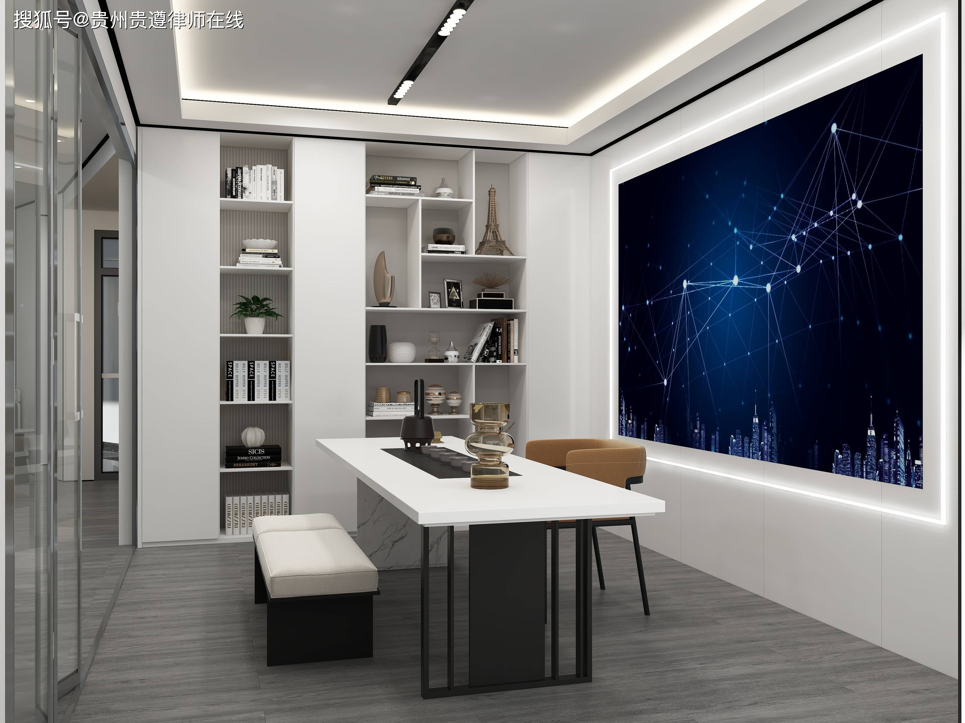 从现场情况看,律所内部功能分区清晰、布局现代。两人位办公室、文件柜、展示柜等基础办公设施已就位,文印室与客户休息区也已完成布置。空间设计上,折叠门灵活分隔区域,背LED大屏的会议或展示区域尤为醒目,整体环境兼具专业感与舒适度。