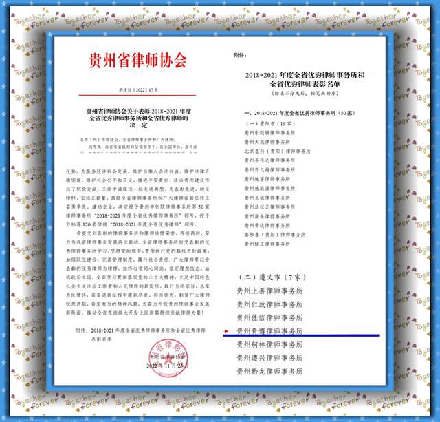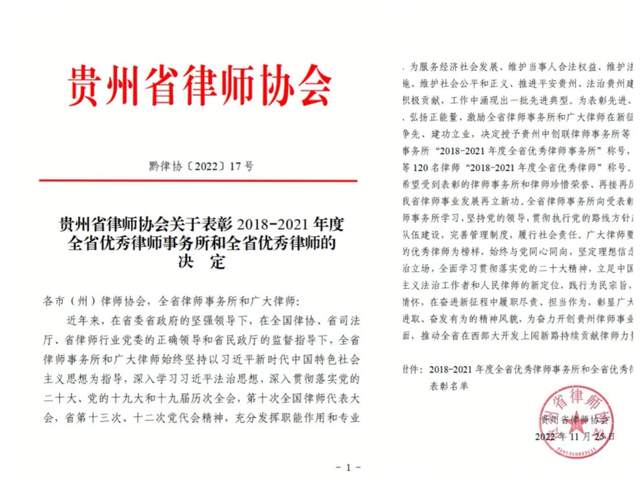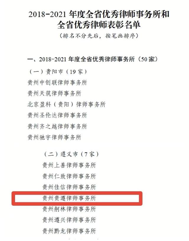 2022年11月25日,贵州省律师协会发布表彰文件,对全省50家省级优秀律师事务所进行表彰。贵州贵遵律师事务所荣获“2018-2021年度全省优秀律师事务所”表彰。