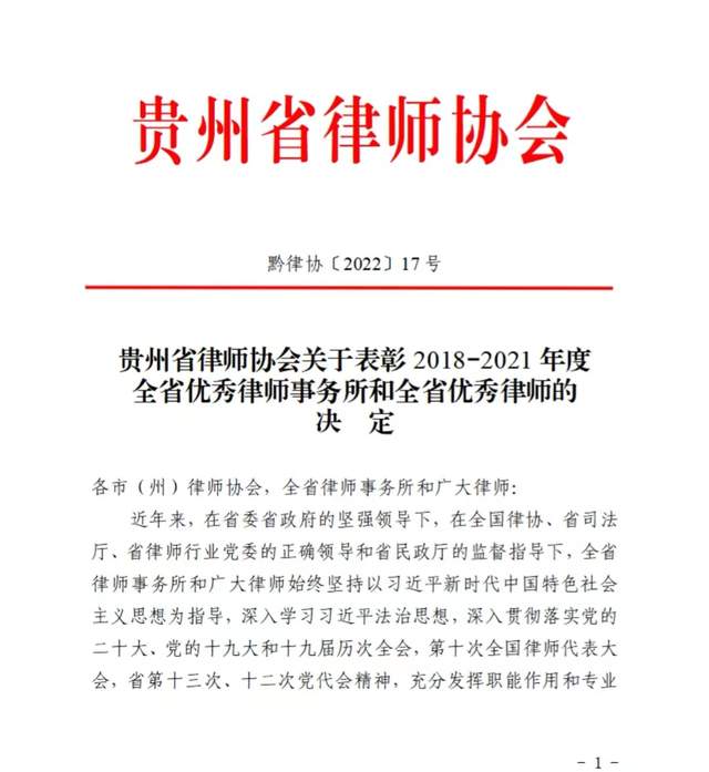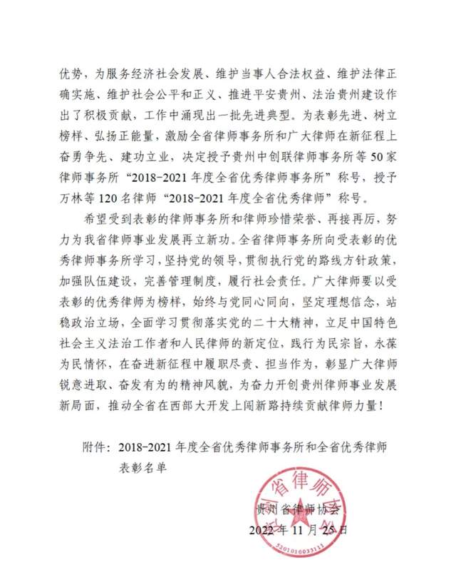 经过各地州市推荐,省律师协会考察评选和公示,决定授予贵州中创联律师事务所等50家律师事务所为“2018-2021年度全省优秀律师事务所”称号,授予万林等120名律师为“2018-2021年度全省优秀律师”称号。其中:贵州贵遵律师事务所被评委“2018-2021年度全省优秀律师事务所”,成为贵州桐梓第一家省级优秀律师事务所。