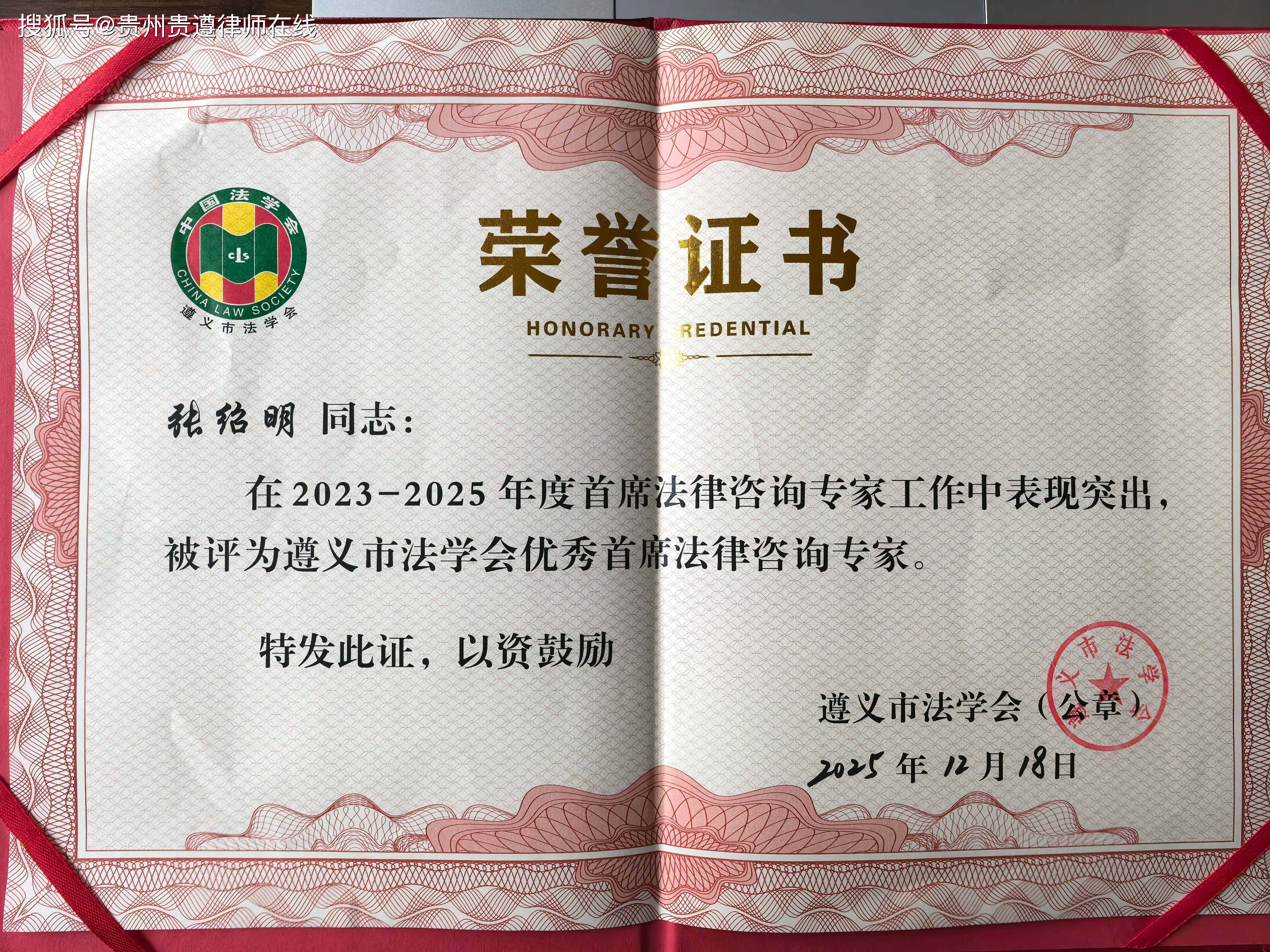 喜讯:贵州桐梓一律师荣获遵义市法学会“优秀首席法律咨询专家”称号