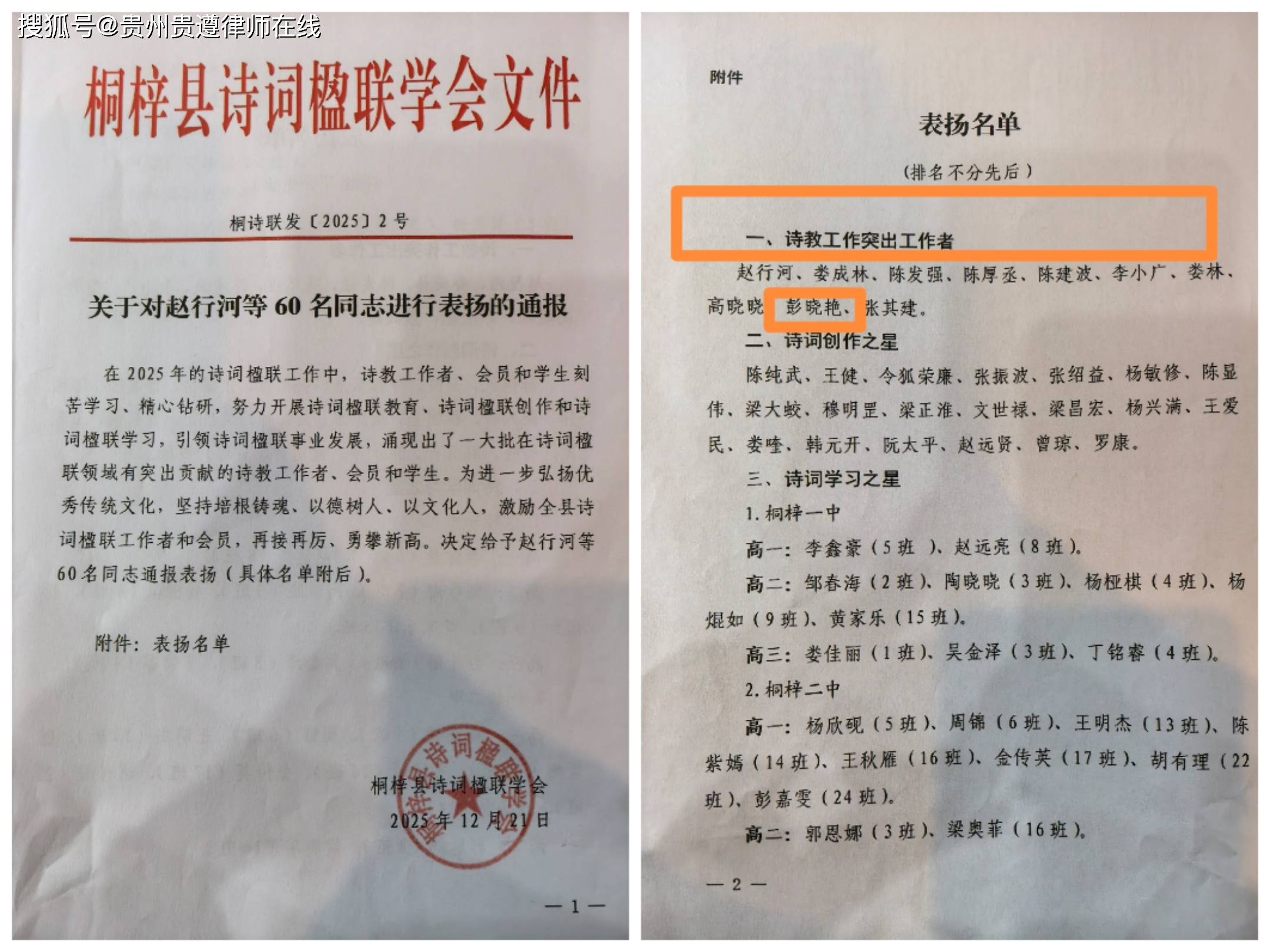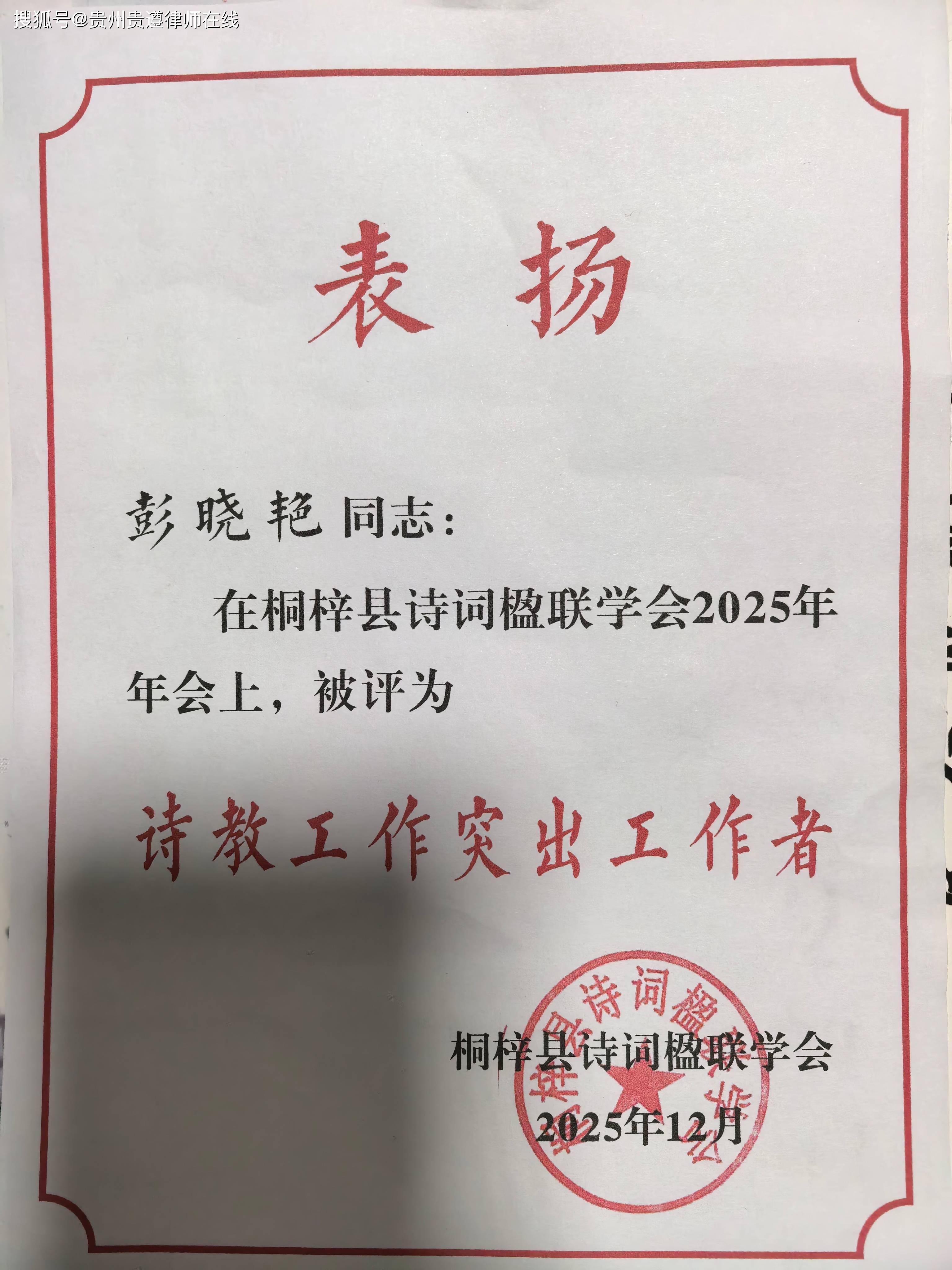 同时,桐梓县诗词楹联学会还对赵行河等60名在诗教工作、诗词创作与学习方面有突出贡献的个人进行表扬。受表扬的名单分为“诗教工作突出工作者”、“诗词创作之星”及“诗词学习之星”三类。其中,贵州贵遵律师事务所彭晓艳律师因在诗教工作中的优异表现受到专门表彰。值得一提的是,“诗词学习之星”涵盖桐梓一中、桐梓二中的多名初高中学生,展现了诗词文化在青少年群体中的蓬勃生机与传承活力。