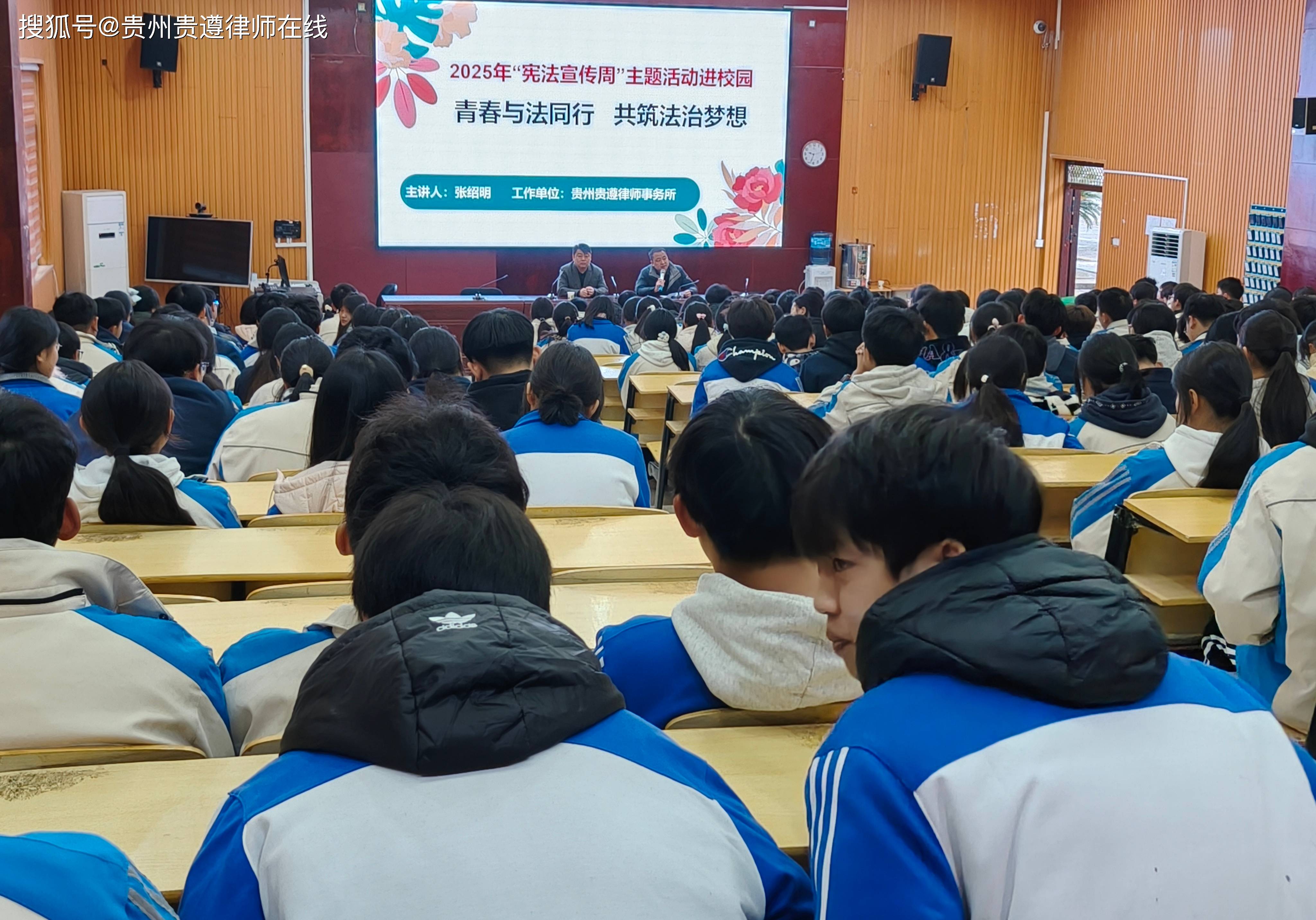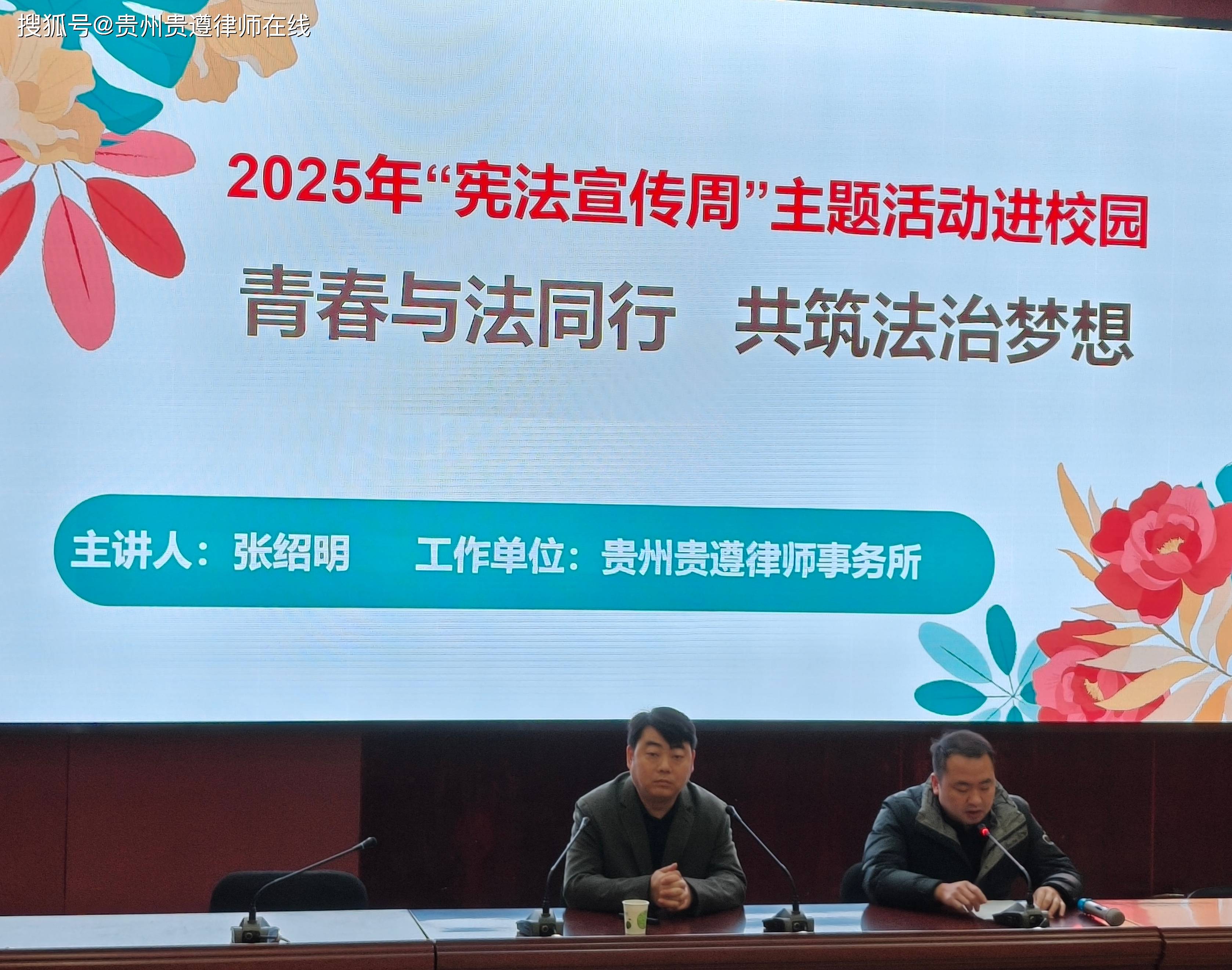2025年12月25日,一场以“青春与法同行,共筑法治梦想”为主题的2025年“宪法宣传周”活动在桐梓县蟠龙高中校园内举行,贵州贵遵律师事务所的律师们结合宪法和民法典的相关规定,为该校高一年级的学生们带来了一堂生动而深刻的法治教育课。