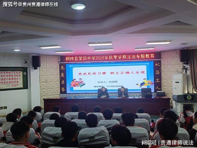 11月27日,贵州贵遵律师事务所党支部书记张绍勇律师走进桐梓县第四中学,为同学们带来一场生动而深刻的法治教育专题讲座。当天,张绍勇律师围绕“学生当前的根本任务”“行为的边界与法律后果”以及“如何树立正确的世界观、人生观、价值观”等三大主题,结合真实案例与经典视频片段,深入浅出地讲解法律知识,引导学生明确学习目标、认清行为底线、理解法治精神,帮助他们走好青春每一步。