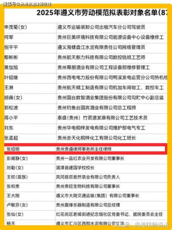 9月15日,遵义市劳动模范和先进工作者推荐评选表彰工作领导小组办公室发布公示,拟对全市87名劳动模范和42名先进工作者进行表彰。其中:贵州贵遵律师事务所主任张绍明律师入榜,名列其中,成为全市唯一入榜律师。贵州贵遵律师事务所主任张绍明律所,经过组织推荐、考核公示,入榜遵义市劳动模范表彰,成为全市唯一入榜律师。