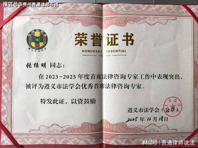 12月18日,遵义市法学会召开首席法律咨询专家座谈会,会议总结了过去三年的法学工作,并表彰了2023-2025年度“优秀首席法律咨询专家”。遵义市委常委、市委政法委书记、市法学会会长李淞出席会议并讲话。会议由市委政法委常务副书记、市法学会常务副会长陶冬主持。经严格的组织推荐、专业评审及社会公示程序,贵州贵遵律师事务所主任张绍明律师凭借其扎实的专业能力、丰富的实践经验和在服务法治建设中的积极贡献,被授予“遵义市优秀首席法律咨询专家”称号。