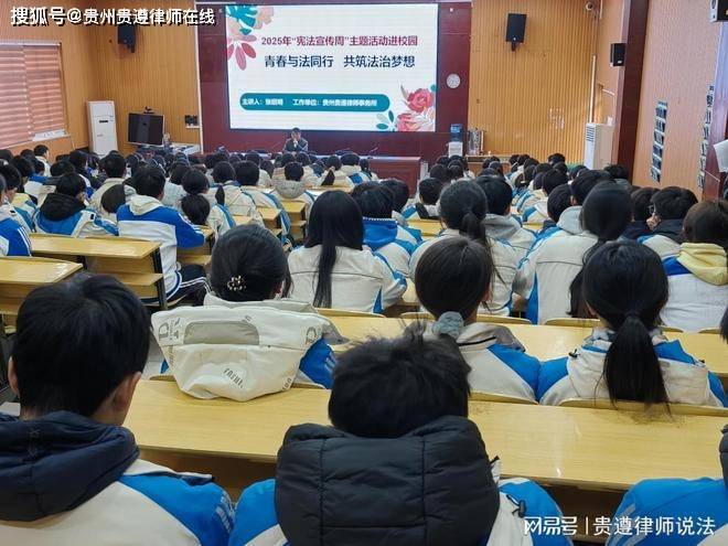 12月25日,一场以“青春与法同行,共筑法治梦想”为主题的2025年“宪法宣传周”活动在桐梓县蟠龙高中校园内举行,贵州贵遵律师事务所的律师们结合宪法和民法典的相关规定,为该校高一年级的学生们带来了一堂生动而深刻的法治教育课。为深入贯彻落实宪法精神,加强青少年法治宣传教育,引导广大学生树立宪法意识、国家意识和法治观念。贵州贵遵律师事务所主任张绍明律师作为桐梓县蟠龙中心的法治辅导员,遵义市首席法律咨询专家,围绕“宪法宣传周”活动主题,结合中学生的年龄特点和认知实际,用通俗易懂的语言、贴近生活的案例,深入浅出地为学习们讲解了宪法的地位、公民的基本权利与义务,以及法律在青少年成长过程中的重要作用。