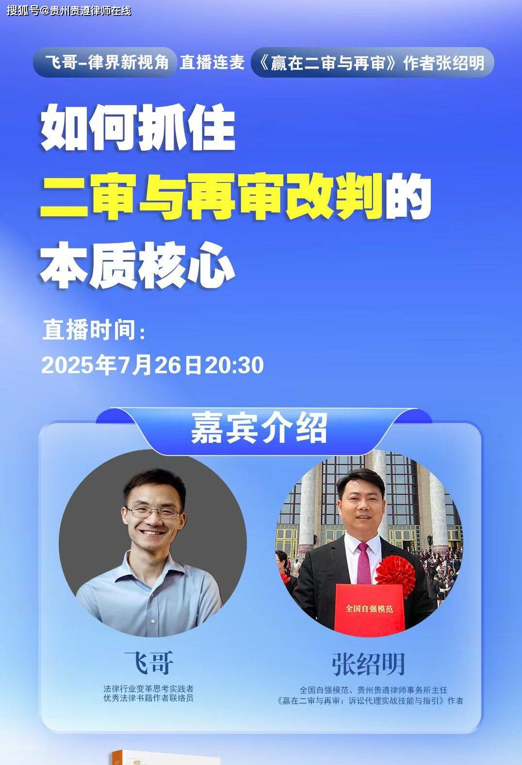 2025年7月26日晚上8时30分,全国自强模范,法律出版社《赢在二审与再审》的作者,贵州贵遵律师事务所主任张绍明律师将做客《抖音》《视频号》等新媒体平台,并且与法律新媒体达人“飞哥-律界新视角-AI浪潮”直播连麦,共同探讨“如何抓住二审与再审改判的本质核心”。