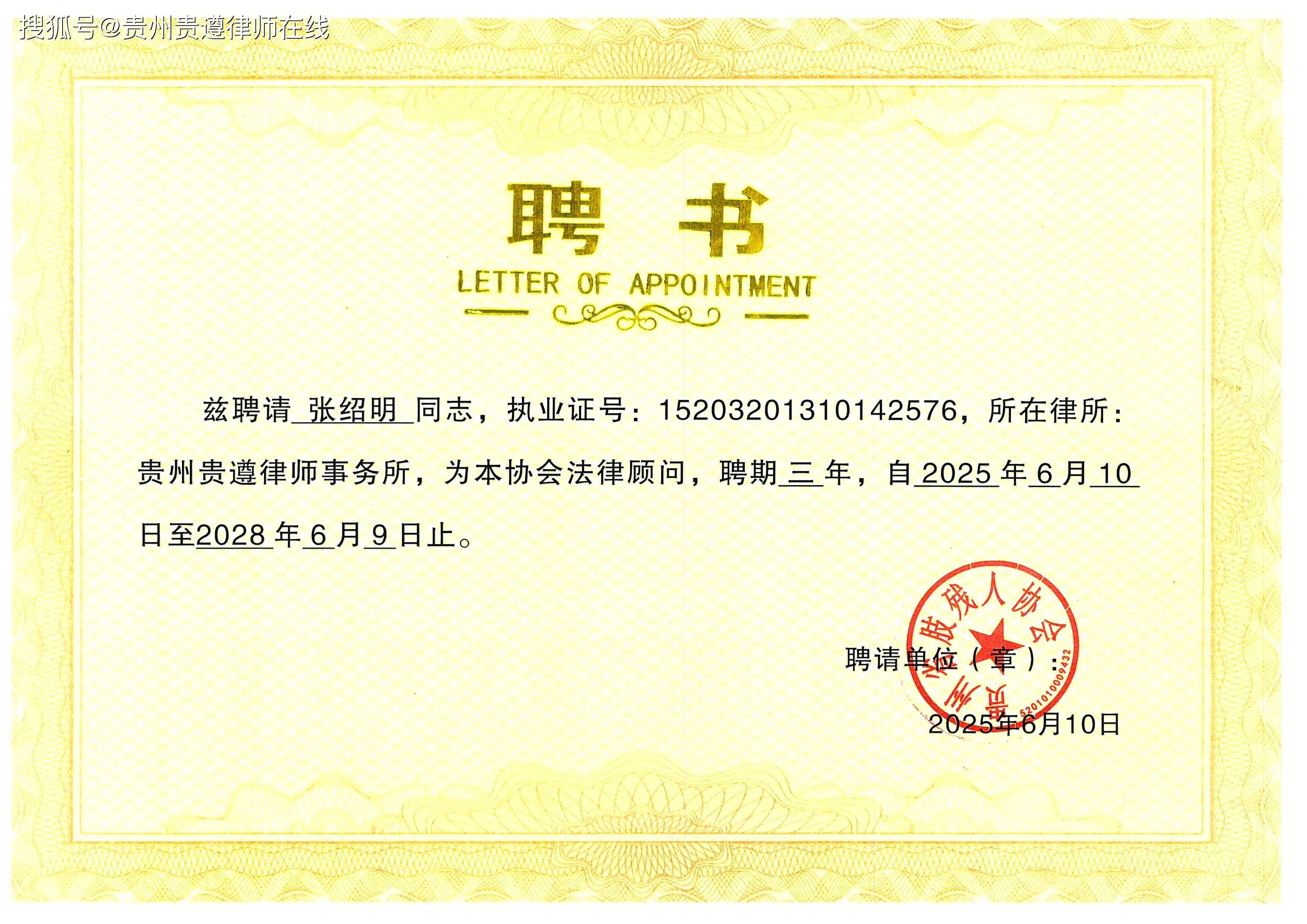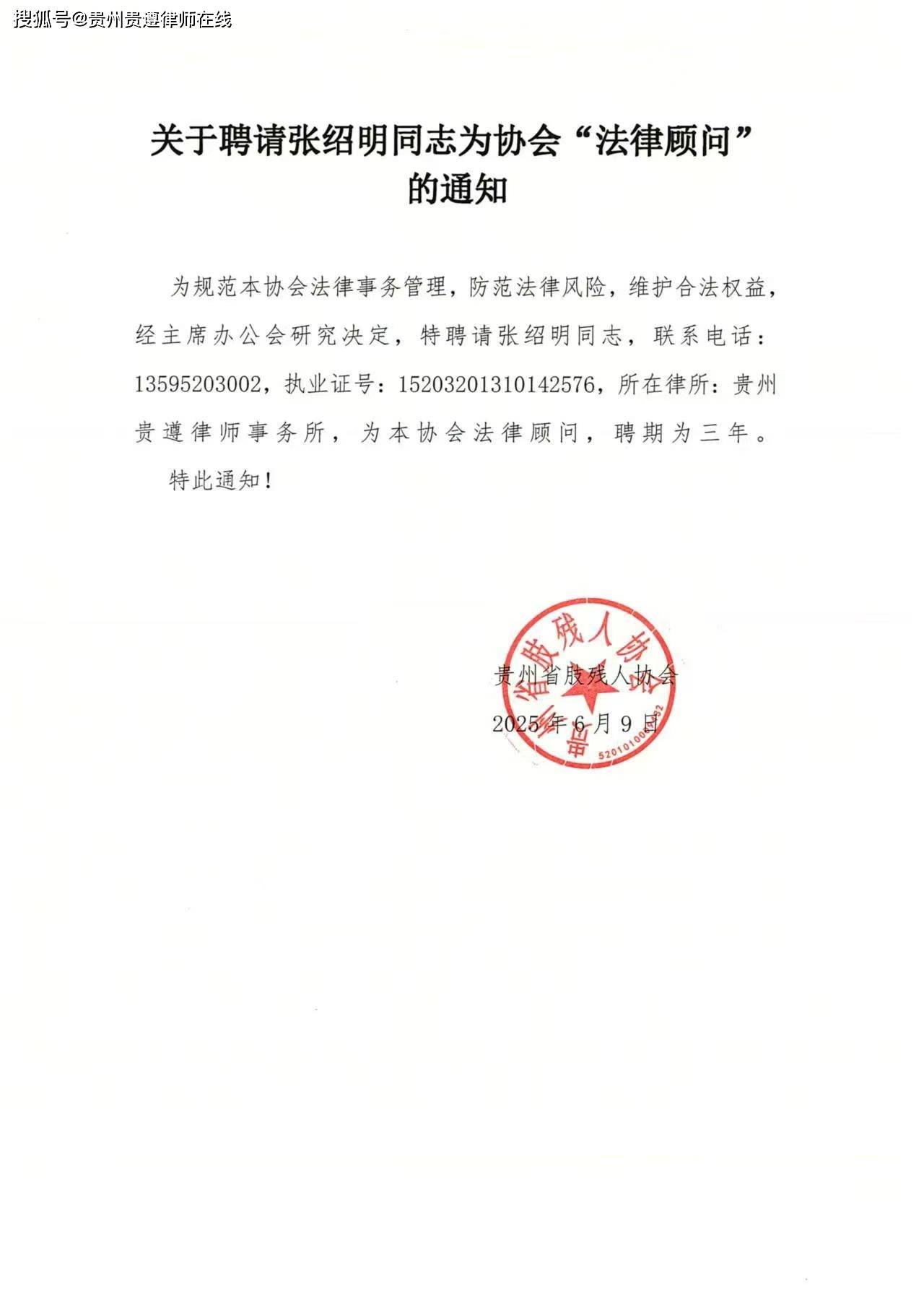 为进一步规范内部事务管理,强化法律风险防控,切实维护协会及会员的合法权益。近日,贵州省肢残人协会经主席办公会研究决定,正式聘请张绍明律师担任协会常年法律顾问,聘期为三年,自2025年6月10日起至2028年6月9日止。