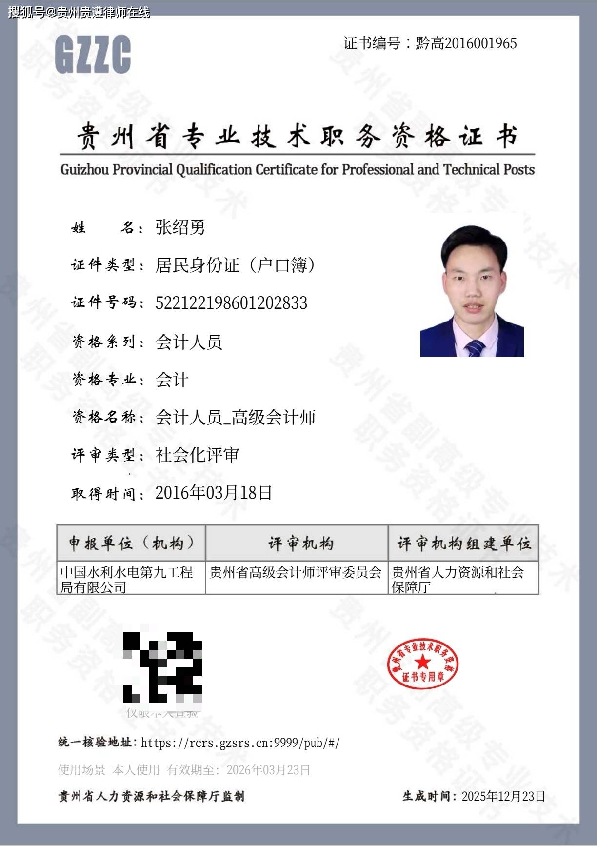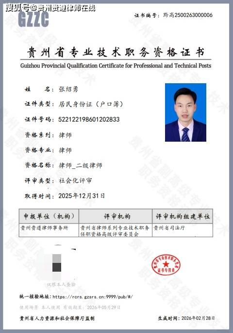 据介绍,该业务由具备高级会计师、高级税务师、高级企业合规师,以及具有二级律师资格的复合型律师张绍勇担任项目负责人。公开信息显示,张绍勇于2016年取得高级会计师资格,税务师资格,以及企业高级合规师资格,后于2025年12月通过贵州省律师系列高级职称评审,取得二级律师资格。