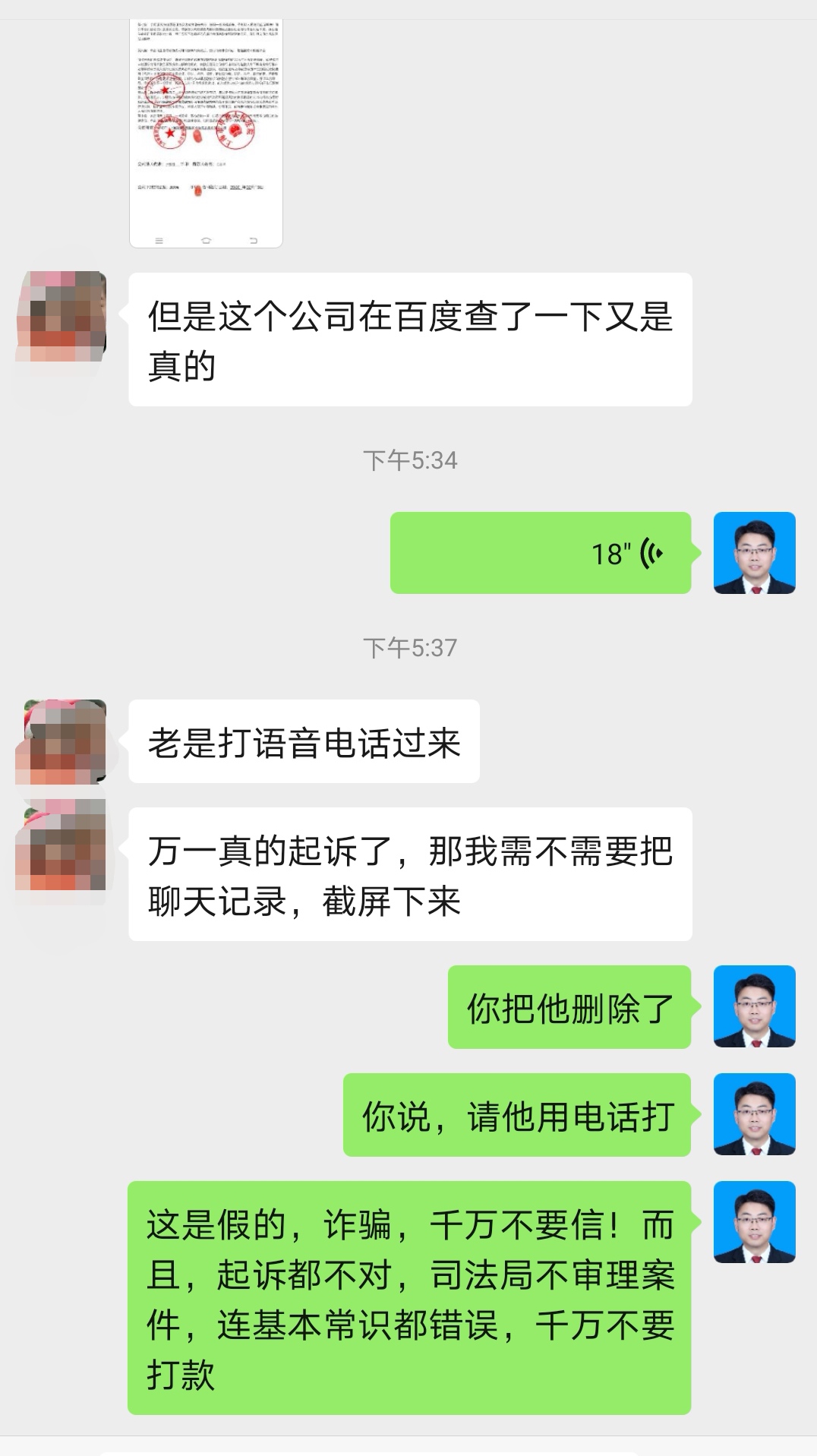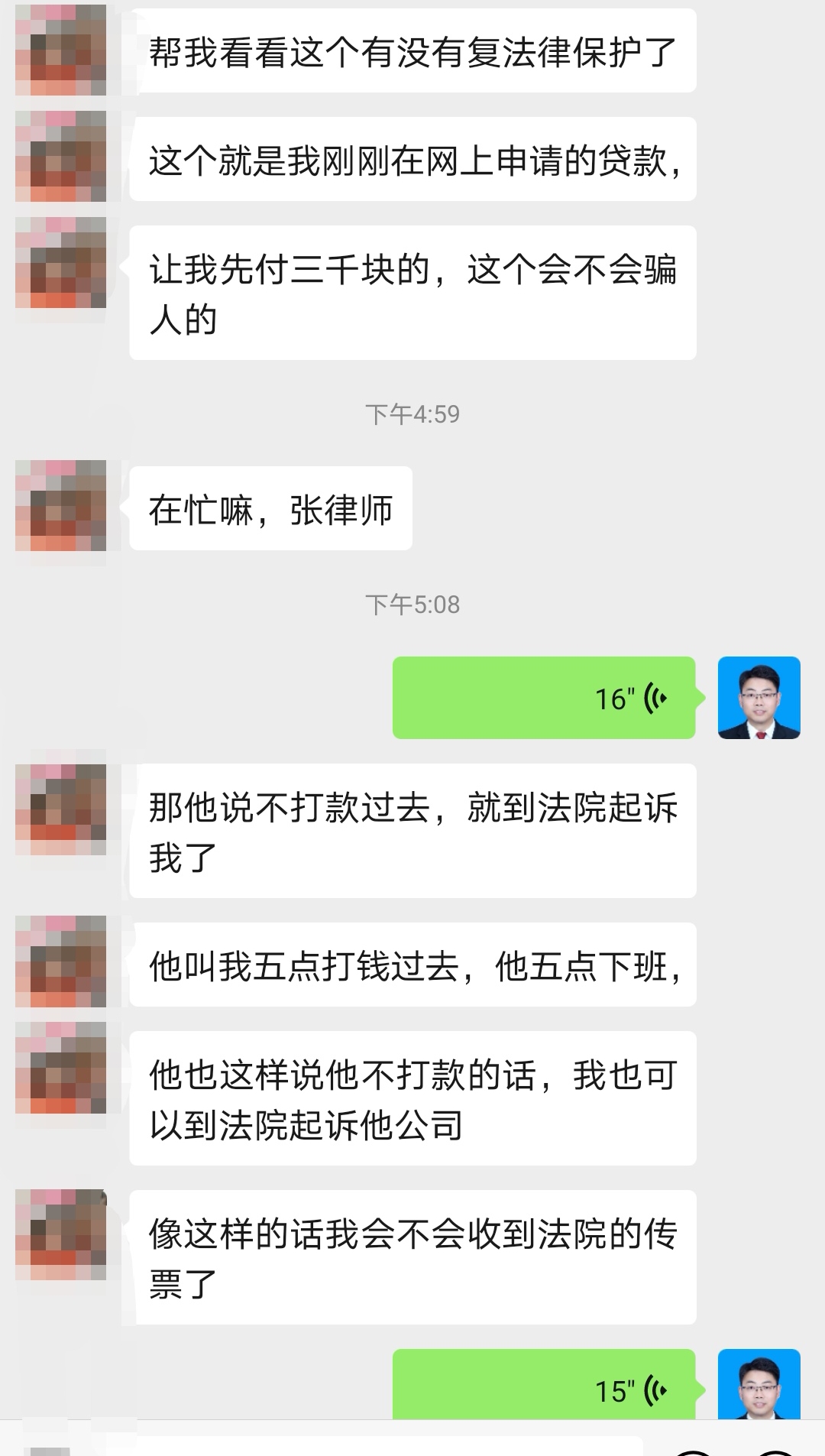 2020年2月18日,桐梓县一女生江某向贵遵律师咨询,也是类似的情况。江女士由于复工复产资金紧张,从而申请短期贷款3万元,江女士填写身份信息和前述相关合同后,对方却要求支付30%的手续费用3000元。后来,江女士感觉情况不对劲,于是咨询贵遵律师。律师建议不要支付,对方竞然明确要去司法局起诉,要求江女士做好聘请律师辩护的准备,以此恐吓江女士。让贵遵律师一看就是外行,一看就是诈骗。