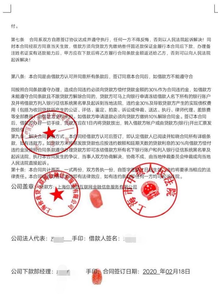 而且,更为荒唐的是,该骗子居然随后在合同上伪造和加盖了中国银行业监督管理委员会、上海市中级人民法院,以及上海你我贷互联网金融信息服务有限公司的印章。让稍有法律素养的人一看就识破是诈骗,而且漏洞百出。