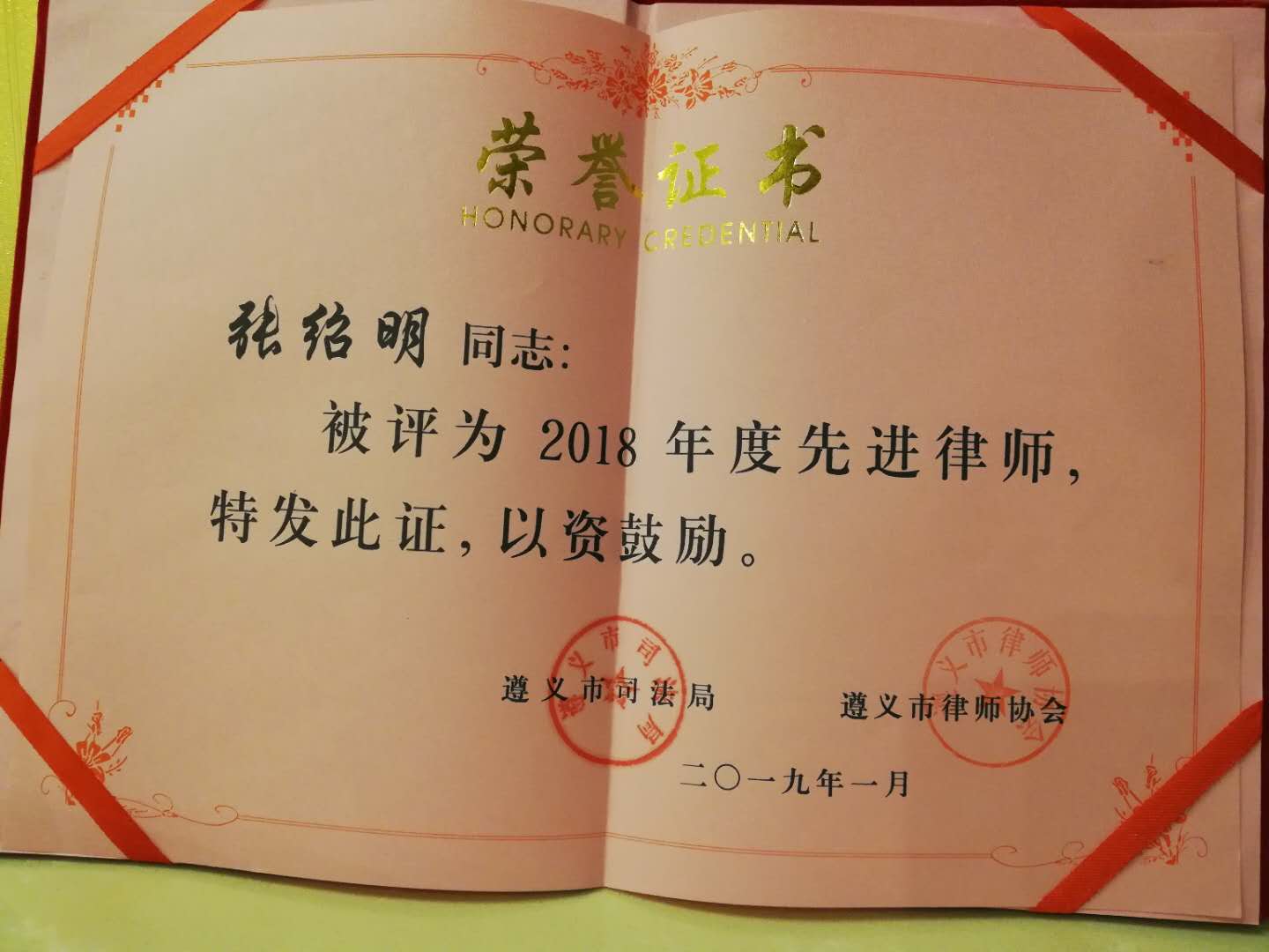 2018年1月18日,遵义市律师协会2019年迎春茶话会在遵义市新蒲新区召开,贵州贵遵律师事务所主任荣获2018年度遵义市先进律师。