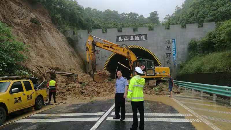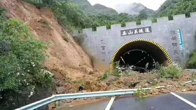 2019年6月22日,在兰海高速公路贵州省桐梓县境内娄山关隧道口,工作人员正在清理被洪水冲垮的路面(手机拍摄)。贵州贵遵律师事务所提醒广大市民注意出行安全。