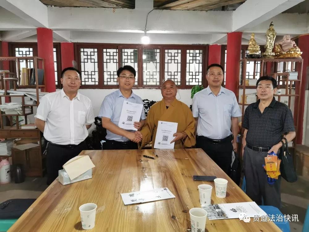 为加强对宗教场所的法治宣传教育工作,提高宗教人士依法信教的法律意识和法治化管理水平。2019年8月9日,贵州贵遵律师事务所在桐梓县政协组织下,到桐梓县尧龙山镇瑞丰寺开展“宗教工作视察调研”与“送法进寺庙”活动,并与瑞丰寺签订了《常年法律顾问合同》,无偿为寺庙提供法律帮助。