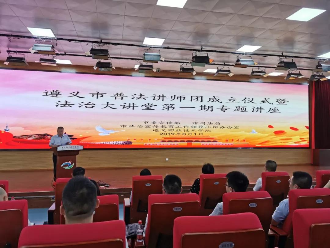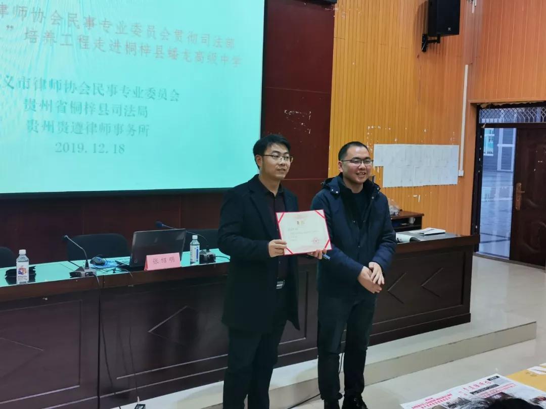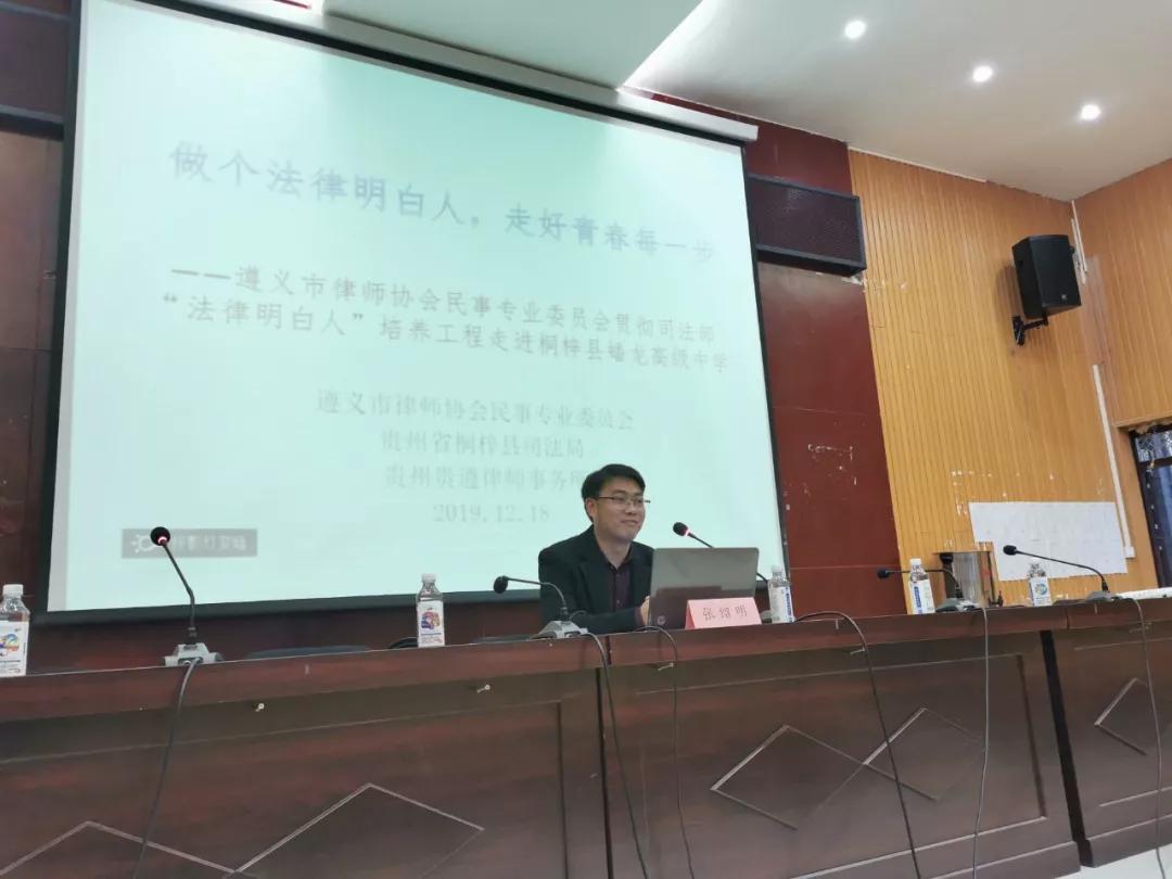 4、2019年12月18日,遵义市律师协会民事专业委员会、桐梓县司法局、贵州贵遵律师事务所组织律师深入桐梓县蟠龙高级中学,开展“法律明白人”培养工程进校园,法治宣讲教育活动。