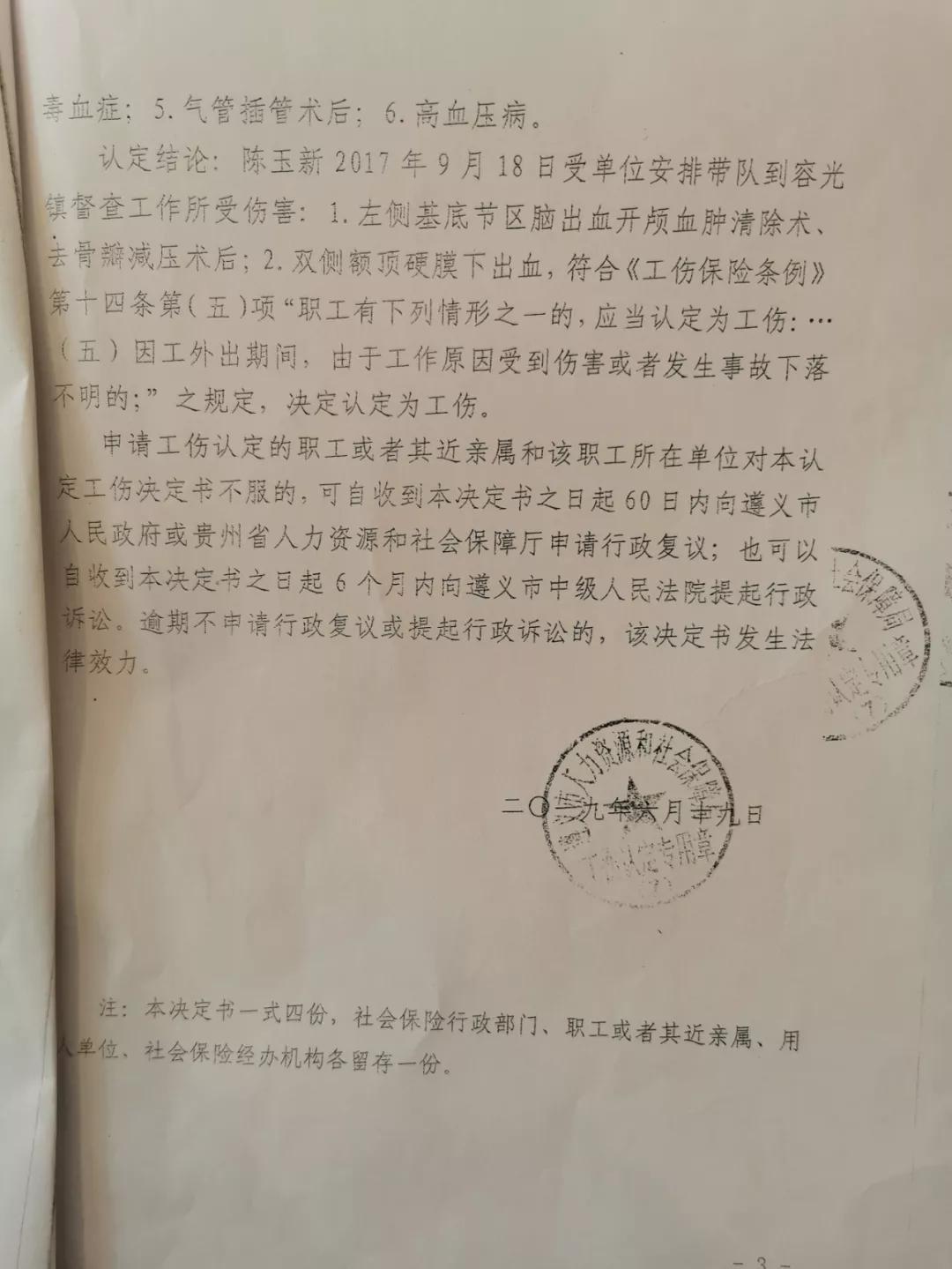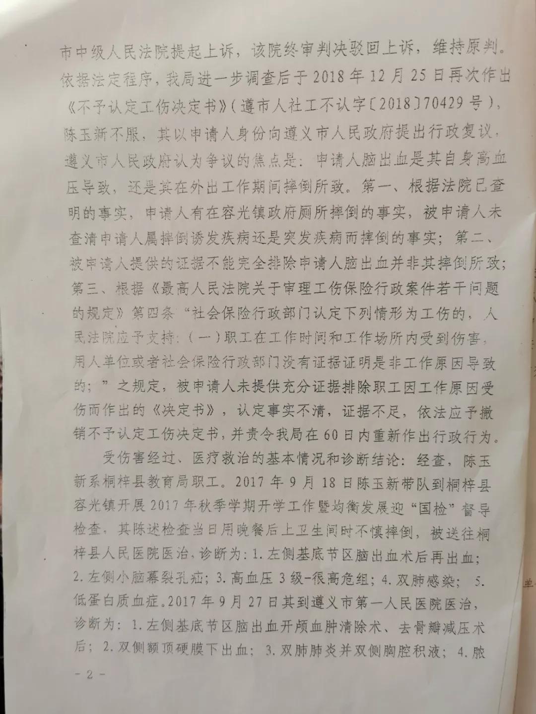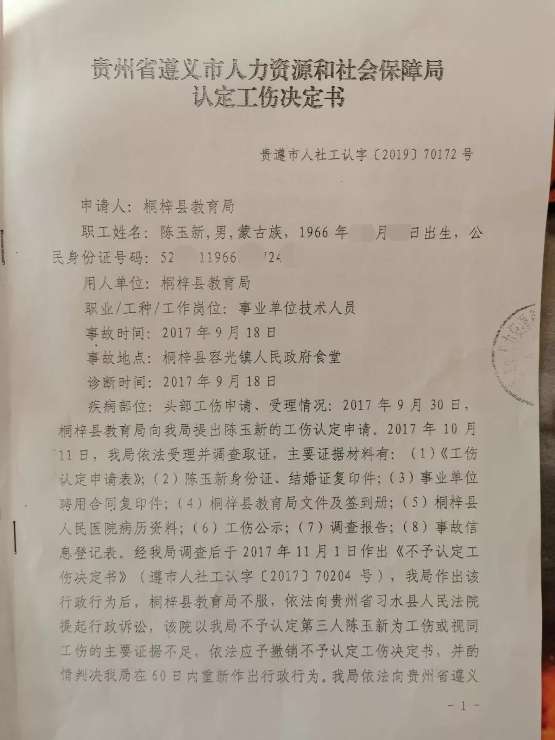 3、2019年9月24日,贵州贵遵律师事务所代理的桐梓县教育局干部陈玉新“脑出血”工伤认定一案,尘埃落定,该案在经历了多次往返诉讼和复议之后,最终被认定为工伤,填补“脑出血”类非典型工伤案件认定的空白。