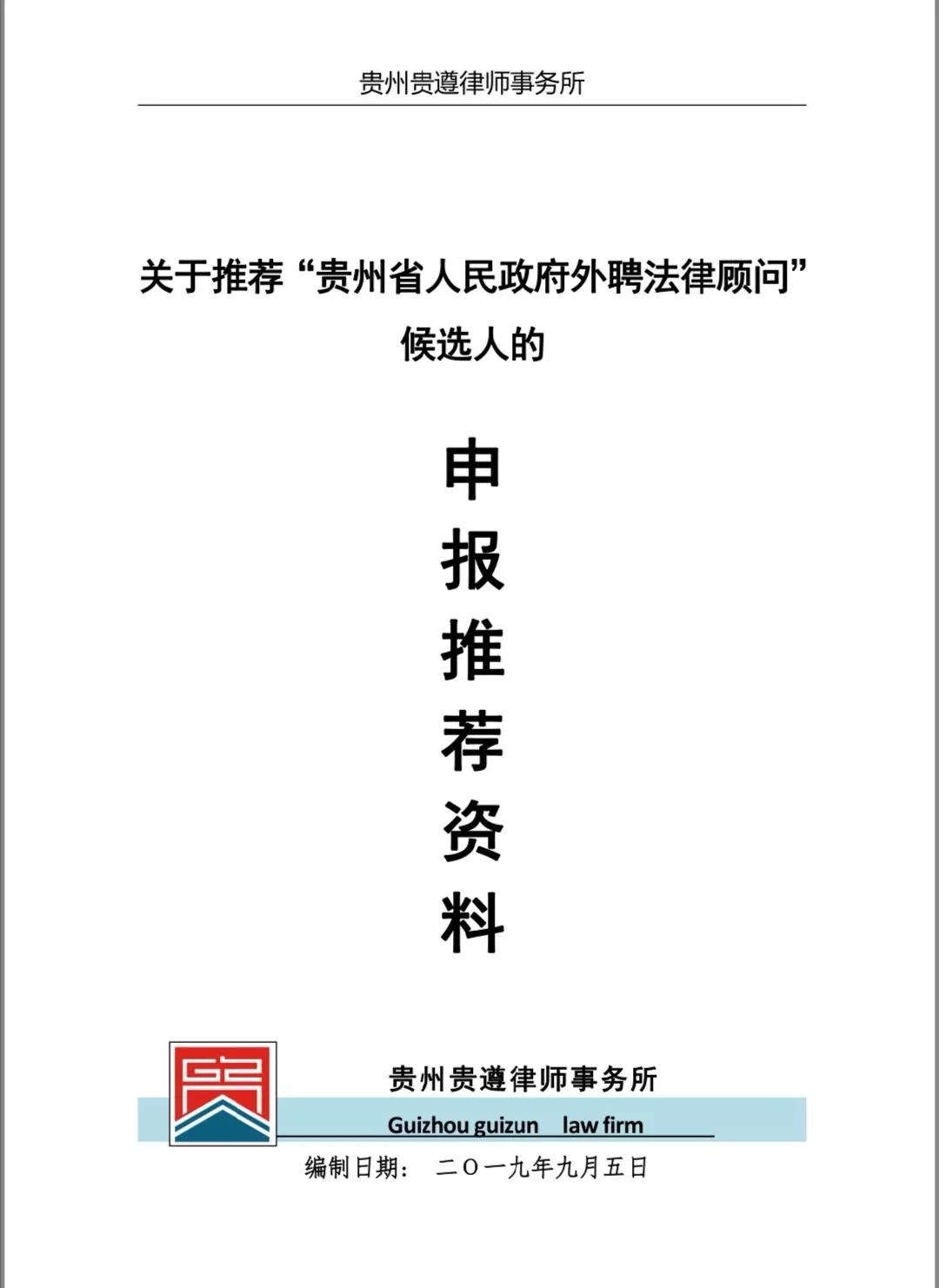 1、2019年9月4日,贵州贵遵律师事务所正式申报推荐“贵州省人民政府外聘法律顾问”。