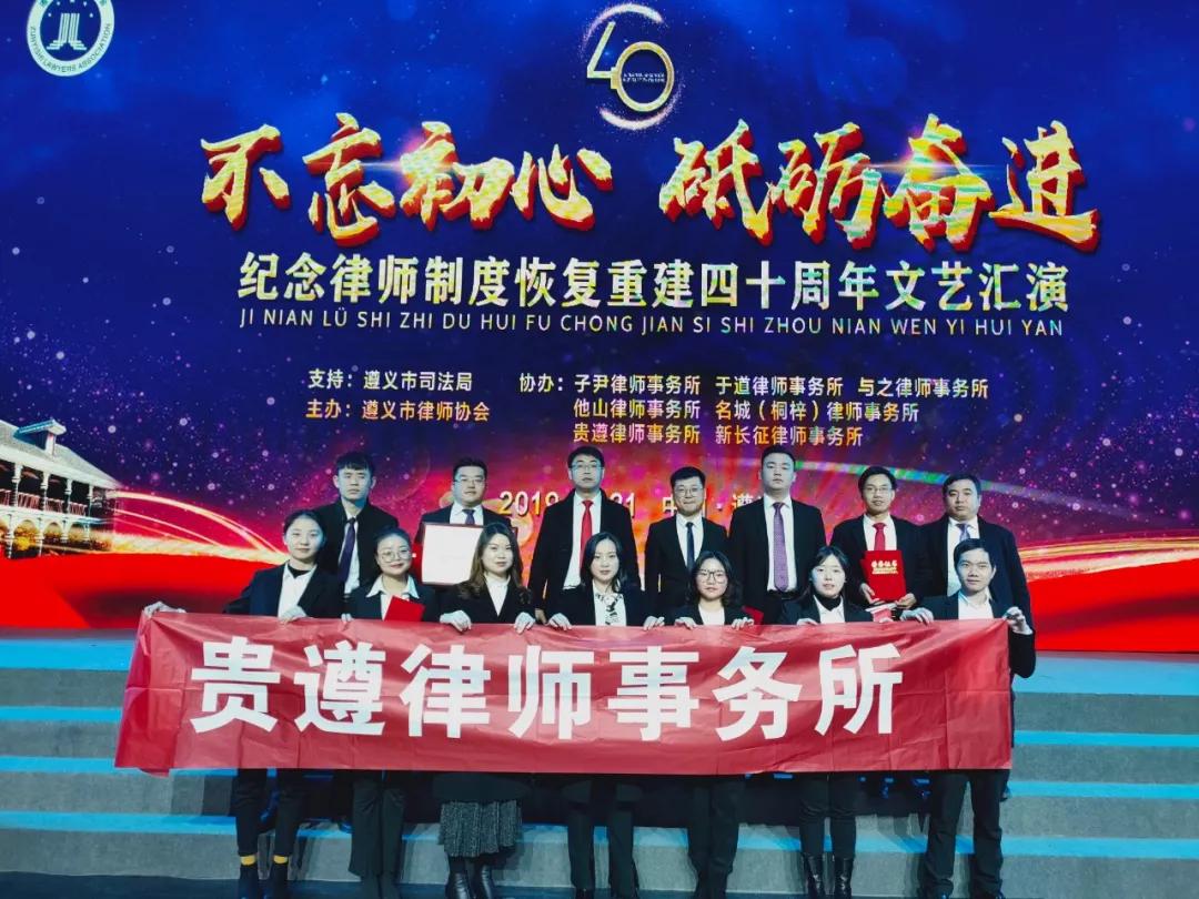 7、2019年12月21日,由遵义市司法局、遵义市律师协会主办的纪念中国律师制度恢复重建四十周年文艺汇演在遵义大剧院隆重举行,会议对2019年度宣传推行仲裁工作的先进集体和先进个人进行了表彰,贵州贵遵律师事务所分别荣获先进集体和先进个人嘉奖。该活动由贵州贵遵律师事务所协办。