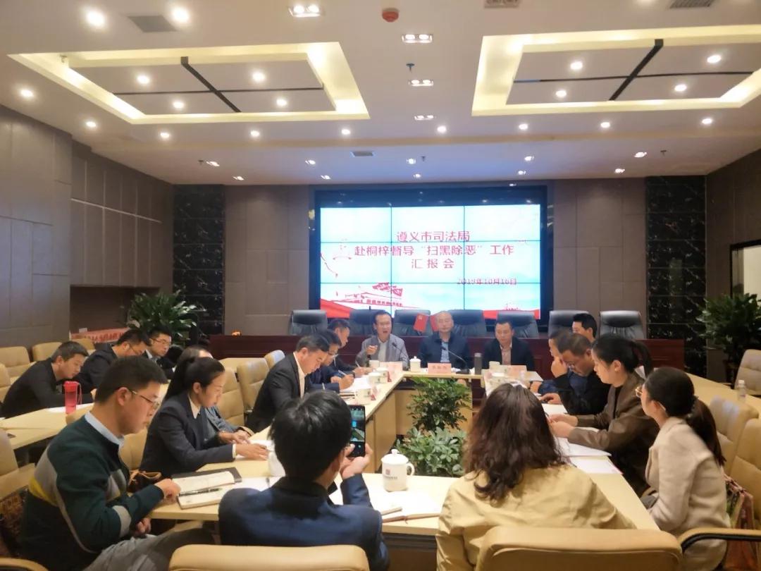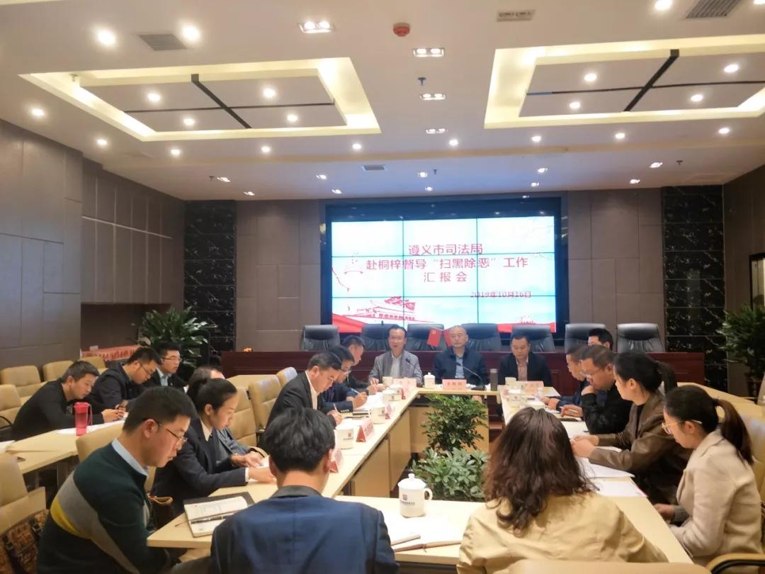 5、2019年10月16日,遵义市司法局李黔阳副局长一行赴桐梓督导扫黑除恶工作,听取了桐梓县司法局及贵遵律师事务所的工作汇报。