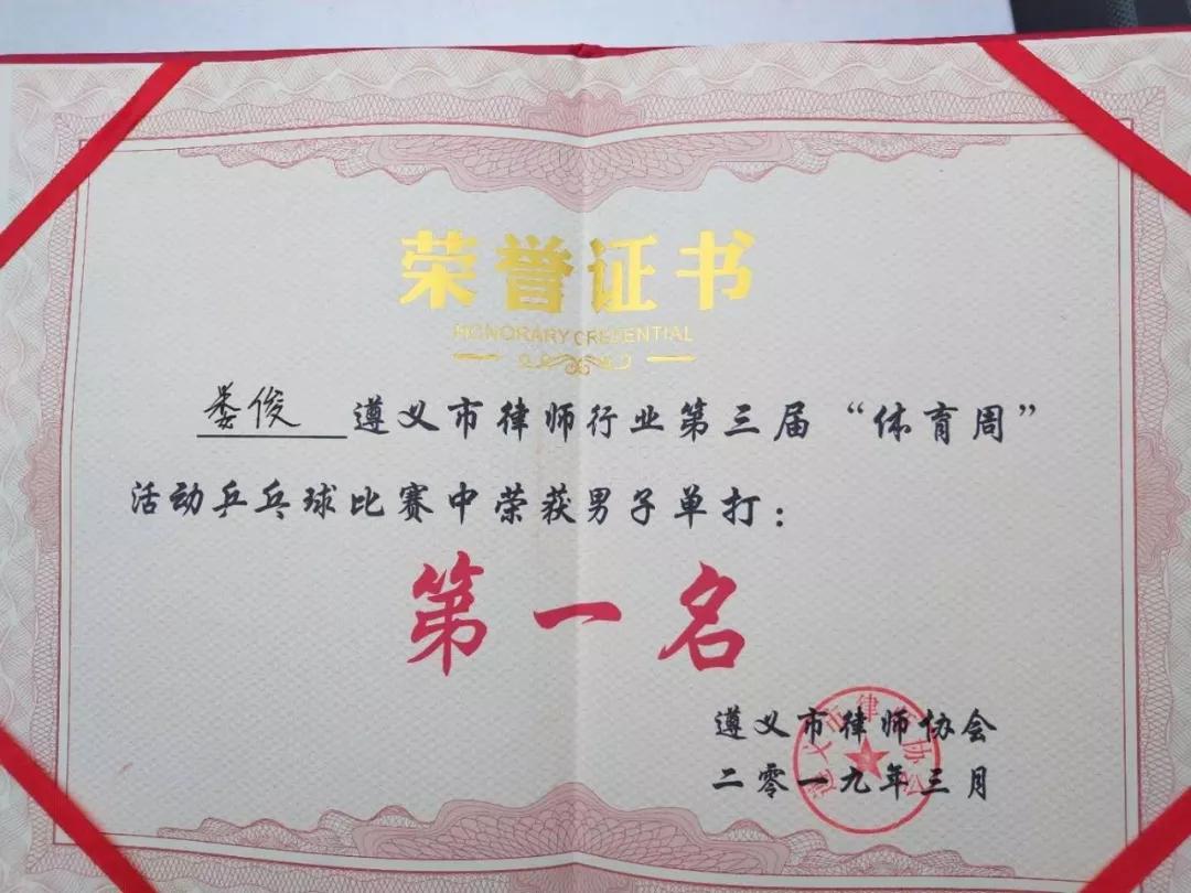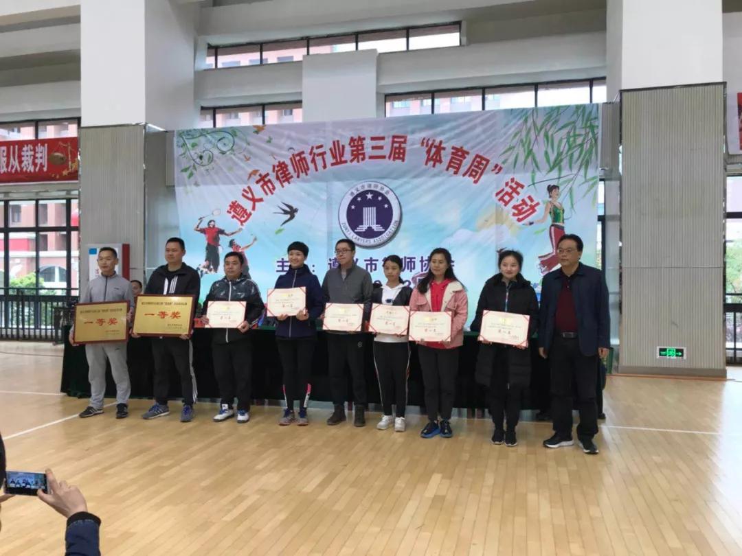 3、2019年3月30日至31日,遵义市律师行业第三届体育周活动在遵义市医药高等专科学校圆满落幕。贵州贵遵律师事务所选派律师10余人参加了男子篮球、拔河、乒乓球等项目的比赛,并勇摘乒乓球比赛冠军。