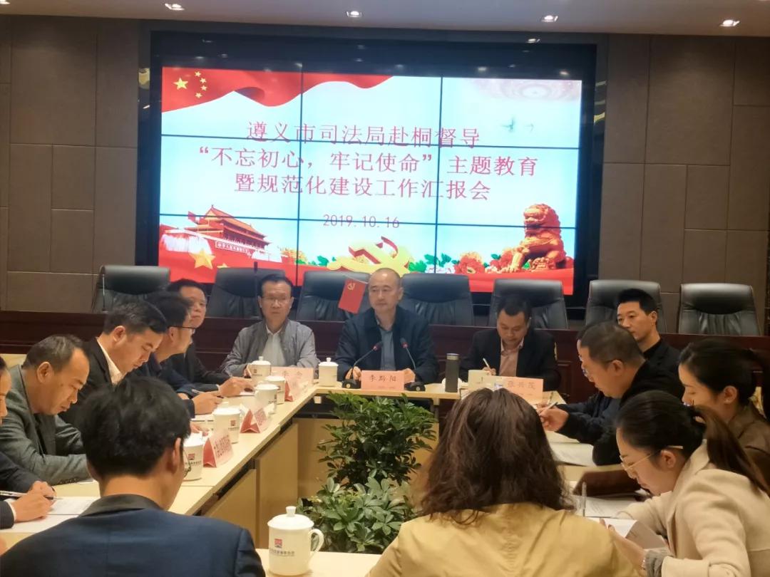 4、2019年10月16日,遵义市司法局李黔阳副局长一行赴桐梓县开展“不忘初心、牢记使命”主题教育暨律师行业党建工作规范化建设督导,并听取了贵遵律师事务所关于“不忘初心、牢记使命”主题教育及“党建工作规范化建设”的贯彻落实情况工作汇报。