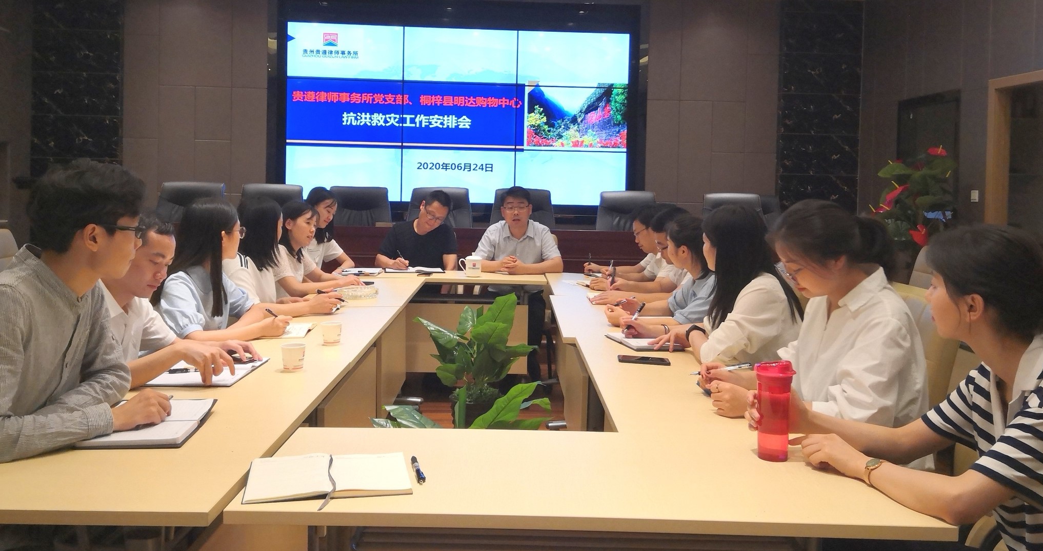 2020年6月24日,中共贵州贵遵律师事务所支部委员会和桐梓县明达购物中心召开紧急动员大会,号召全体党员干部、工作人员积极参与抗洪救灾工作。
