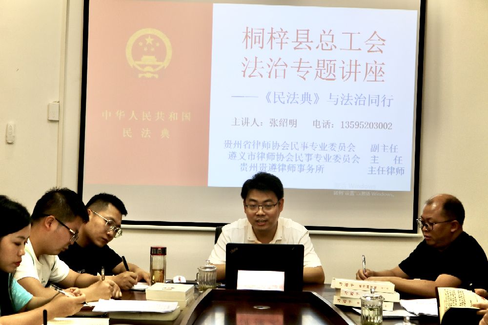 2021年7月7日,遵义市推进民法典实施贵州省基层普法队伍“万人大培训”市级讲师团成员、遵义市十佳律师,贵州贵遵律师事务所主任张绍明应邀到桐梓县总工会开展“《民法典》与新时代工会工作”线下专题法治讲座,桐梓县总工会全体干部参加了当天的专题宣讲活动。