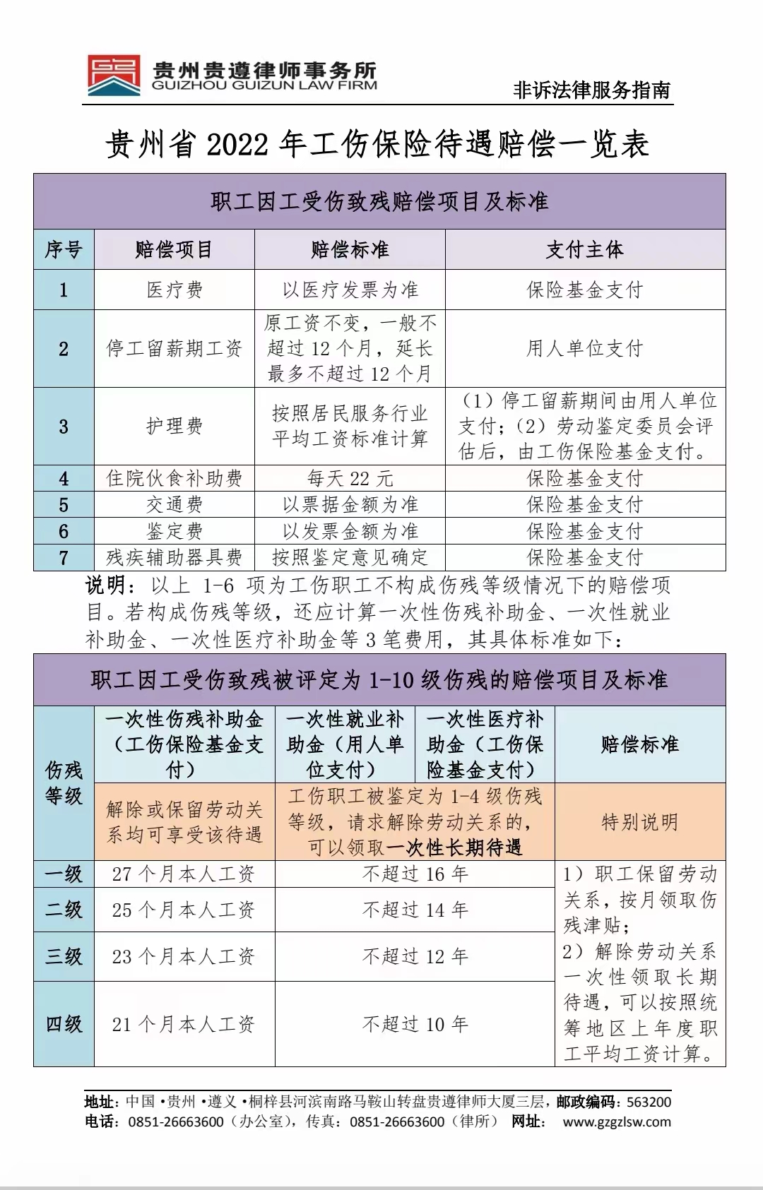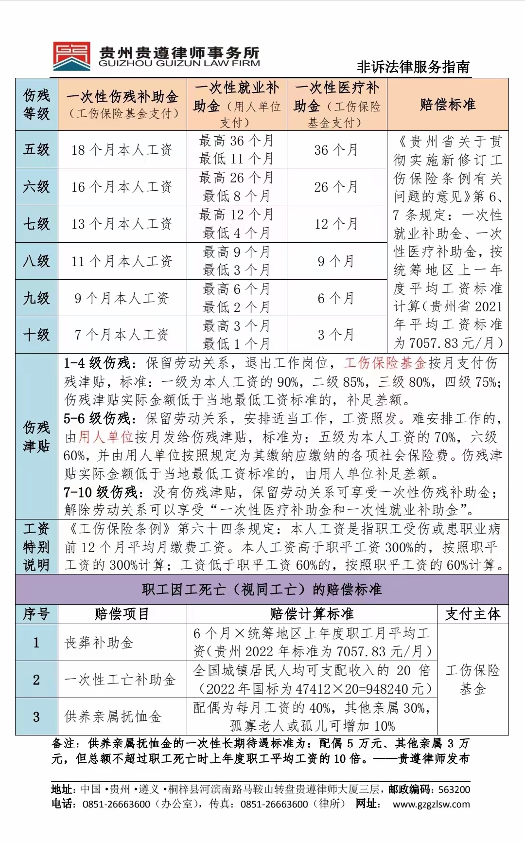 为了给广大律师办理“工伤保险待遇”赔偿案件及“因工死亡”案件提供高效、优质、便捷、准确的非诉法律服务指引,减少律师查阅工伤保险法律法规的时间,避免计算工伤保险待遇赔偿案件时出现漏项,并且帮助年轻律师准确掌握各类赔偿项目的支付责任主体。日前,贵州贵遵律师事务所编制了《贵州省2022年工伤保险待遇赔偿案件一览表》,供大家参考。