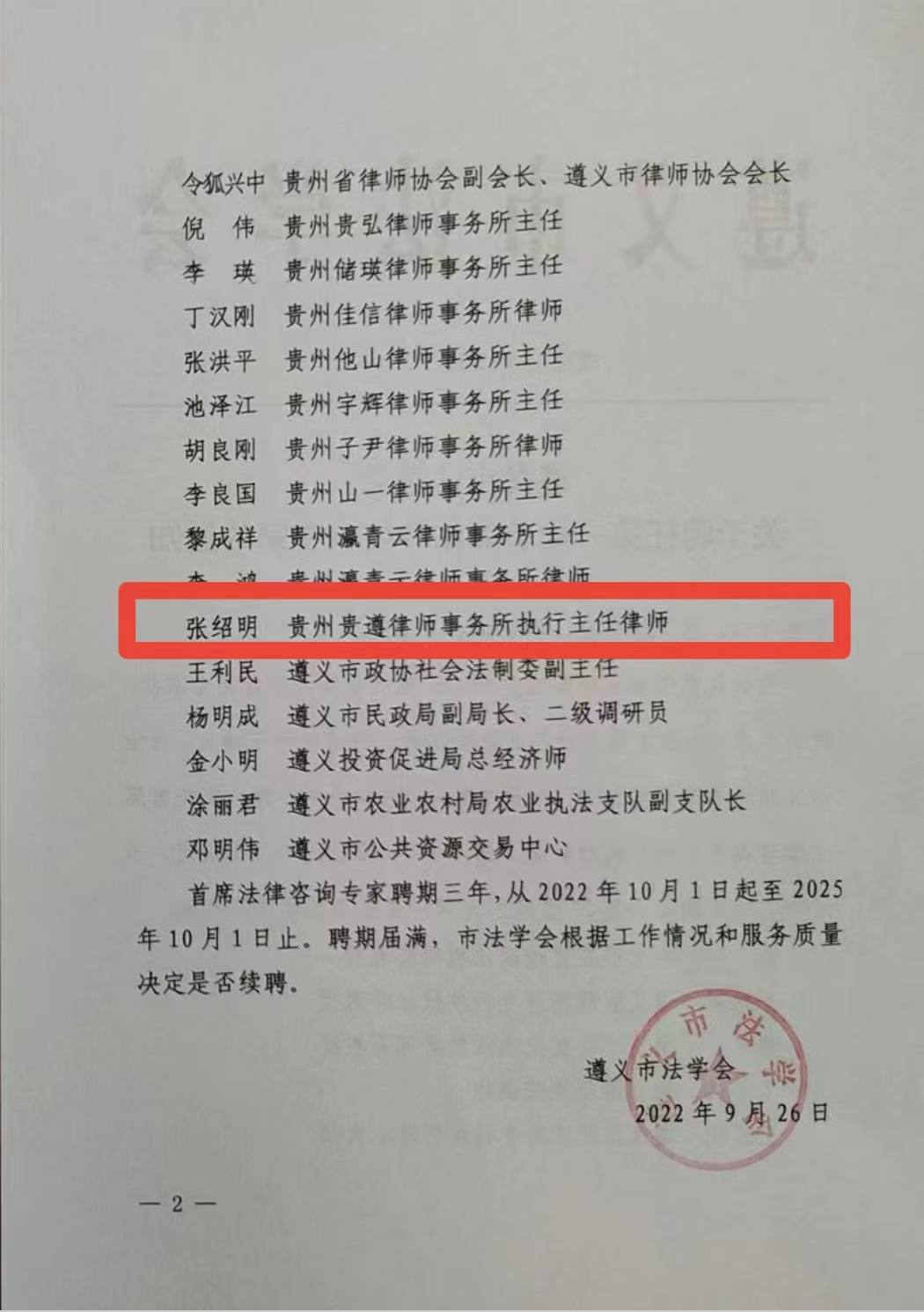 据介绍,为发挥全市广大法学工作者在平安遵义、法治遵义建设中的职能作用,根据中国法学会工作要求,遵义市法学会决定建立实施首席法律咨询专家制度,并聘请黄宇、王鹏森、李兴开、王冬梅、王滢钦、令狐兴中、倪伟、李瑛、丁汉刚、张洪平、池泽江、胡良刚、李良国、黎成祥、李鸿、张绍明、王利民、杨明成、金小明、涂丽君、邓明伟等21名教授、讲师、律师担任遵义市法学会第一届首席法律咨询专家。贵州贵遵律师事务所主任张绍明律师名列其中。