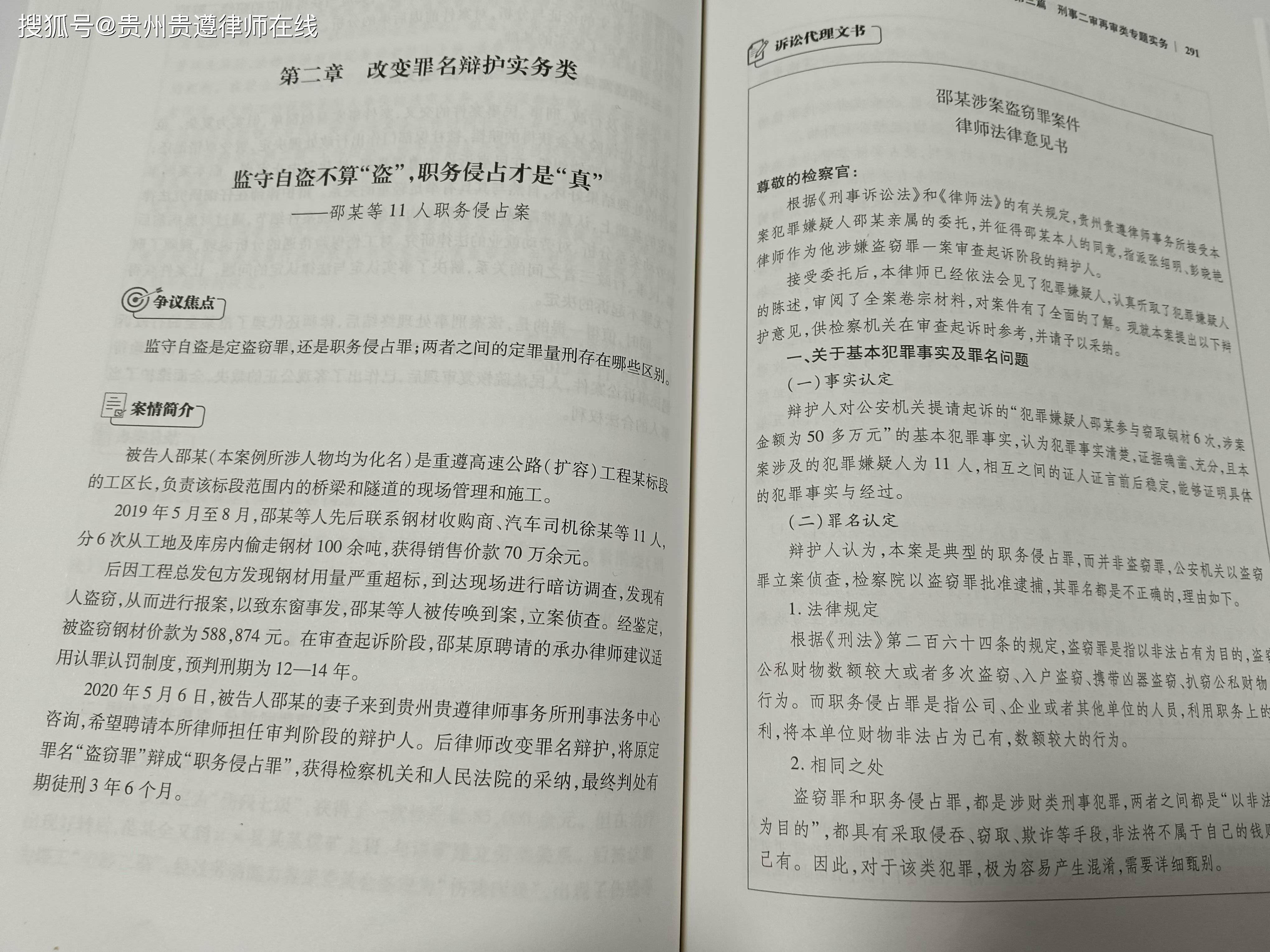 2020年5月6日,被告人邵某的妻子来到贵州贵遵律师事务所刑事法务中心咨询,希望聘请本所律师担任审判阶段的辩护人。后律师改变罪名辩护,将原定罪名“盗窃罪”辩成“职务侵占罪”,获得检察机关和人民法院的采纳,最终判处有期徒刑3年6个月。