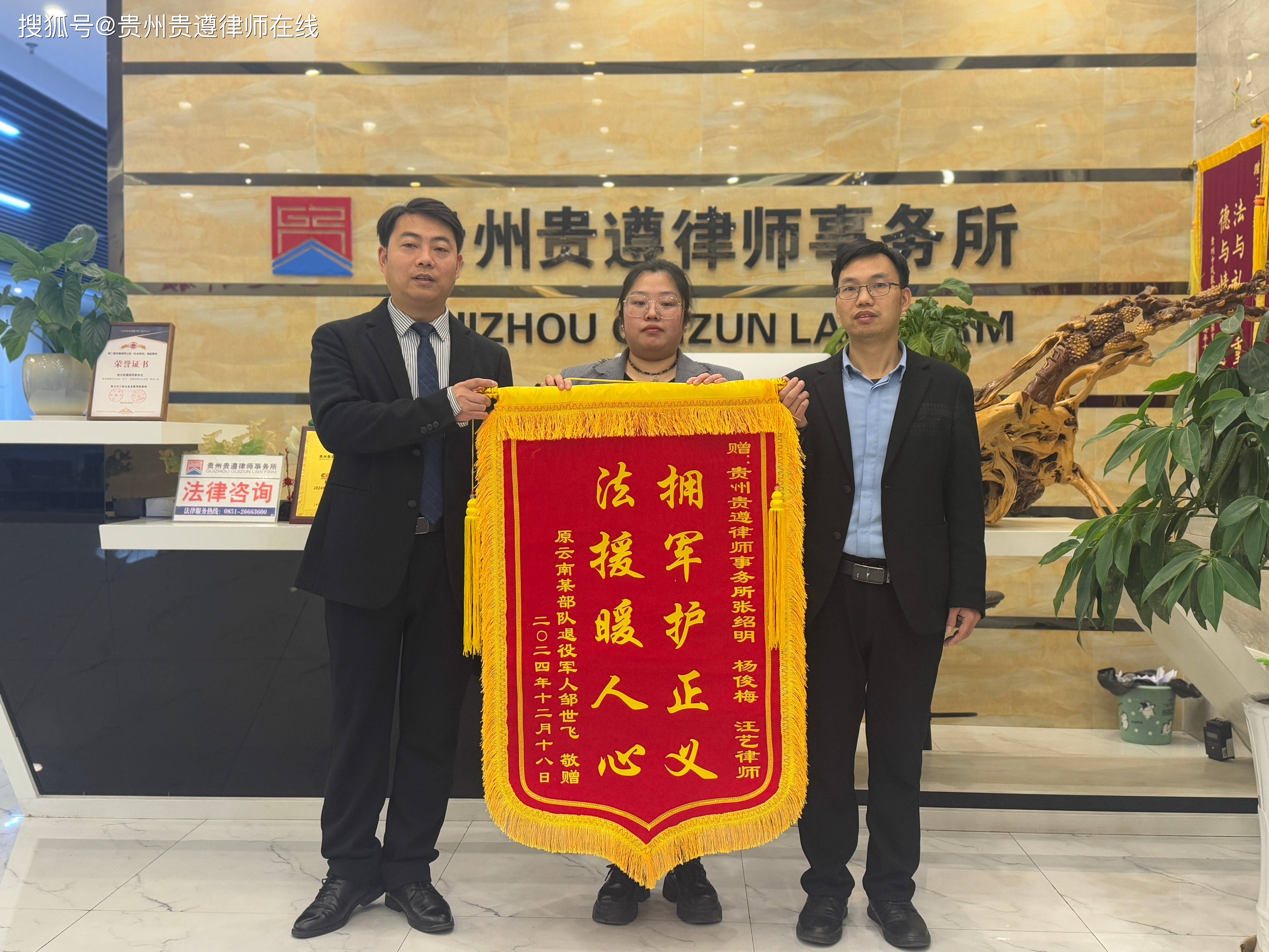 日前,邹某某为了表达对贵遵律师的感谢,特意来到贵州贵遵律师事务所,将一面印制有“拥军护正义,法援暖人心”的锦旗赠送给杨俊梅、汪艺等律师。
