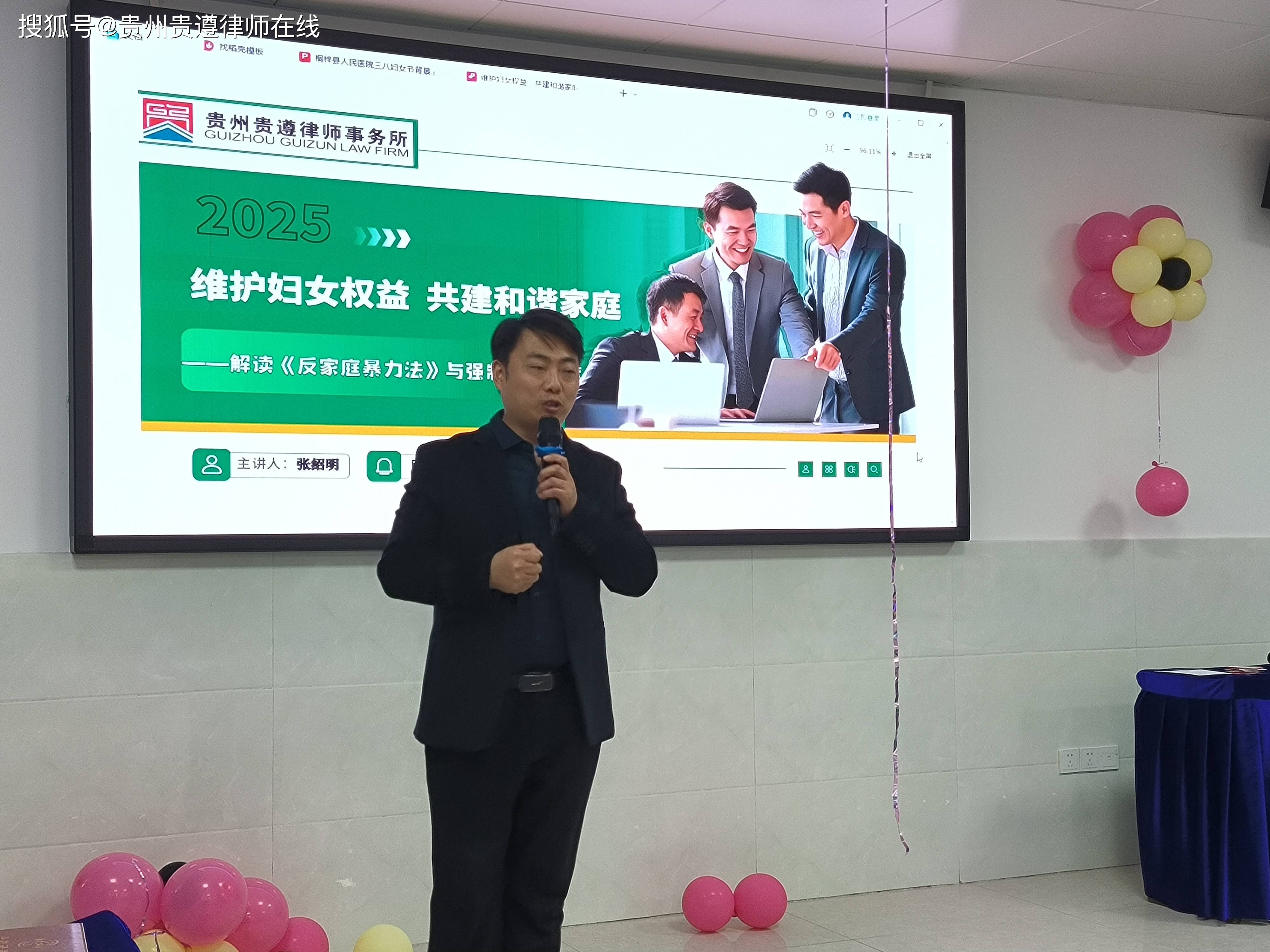 当天下午,贵州贵遵律师事务所主任张绍明律师受桐梓县妇联的安排,以《维护妇女权益,共建和谐家庭——解读反家庭暴力法与强制报告制度》为题,从国际妇女节与反家暴法的社会意义、《反家庭暴力法》核心解读、强制报告制度的实施与责任、典型案例分析、如何应对家庭暴力、互动问答环节等六个方面,与医护人员们进行了详细的讲解,切实增强妇女的自我保护意识,帮助医护人员了解家庭暴力的类型、预防及保护措施,并重点讲解了强制报告制度的法律义务,推动医护人员在发现家庭暴力时,及时履行报告责任,促进社会力量参与反家暴工作,呼吁全社会共同营造安全、平等、和谐的家庭与社会环境,打破“家丑不可外扬”的陈旧观念。