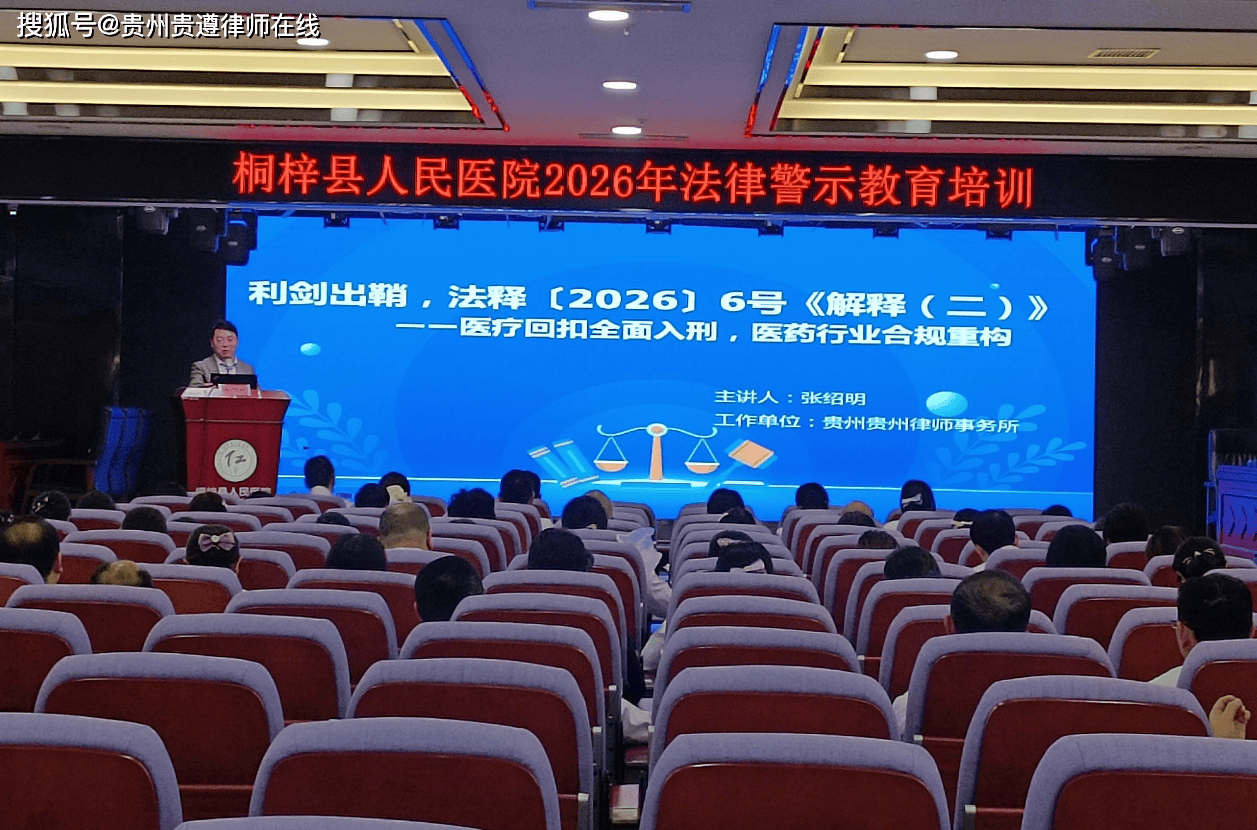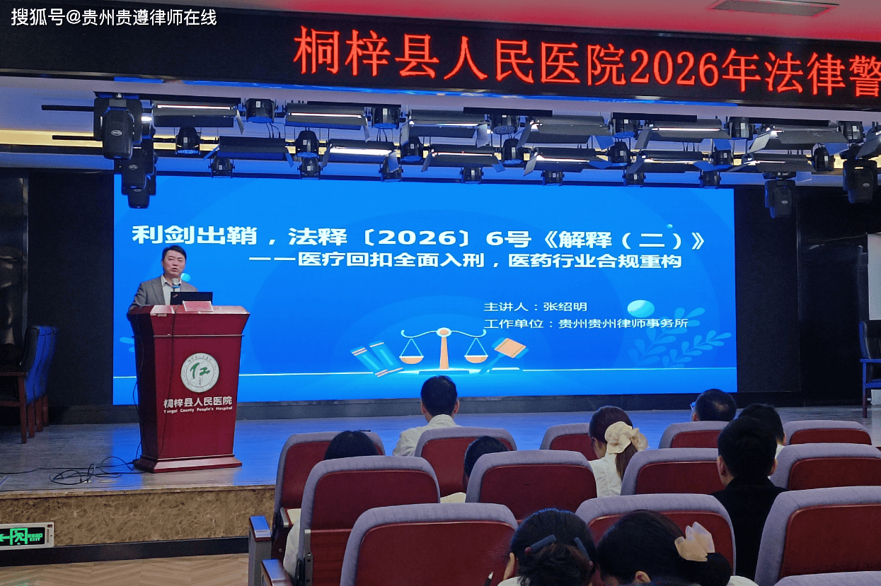 • “医疗回扣,不再只是违纪,而是货真价实的犯罪!”4月26日,桐梓县人民医院举办2026年法律警示教育培训,邀请贵州贵遵律师事务所主任张绍明律师,就“两高”最新发布的法释〔2026〕6号《关于办理贪污贿赂刑事案件适用法律若干问题的解释(二)》进行深度解读。这场题为“医疗回扣全面入刑,医药行业合规重构”的讲座,为参训人员敲响了法律警钟。